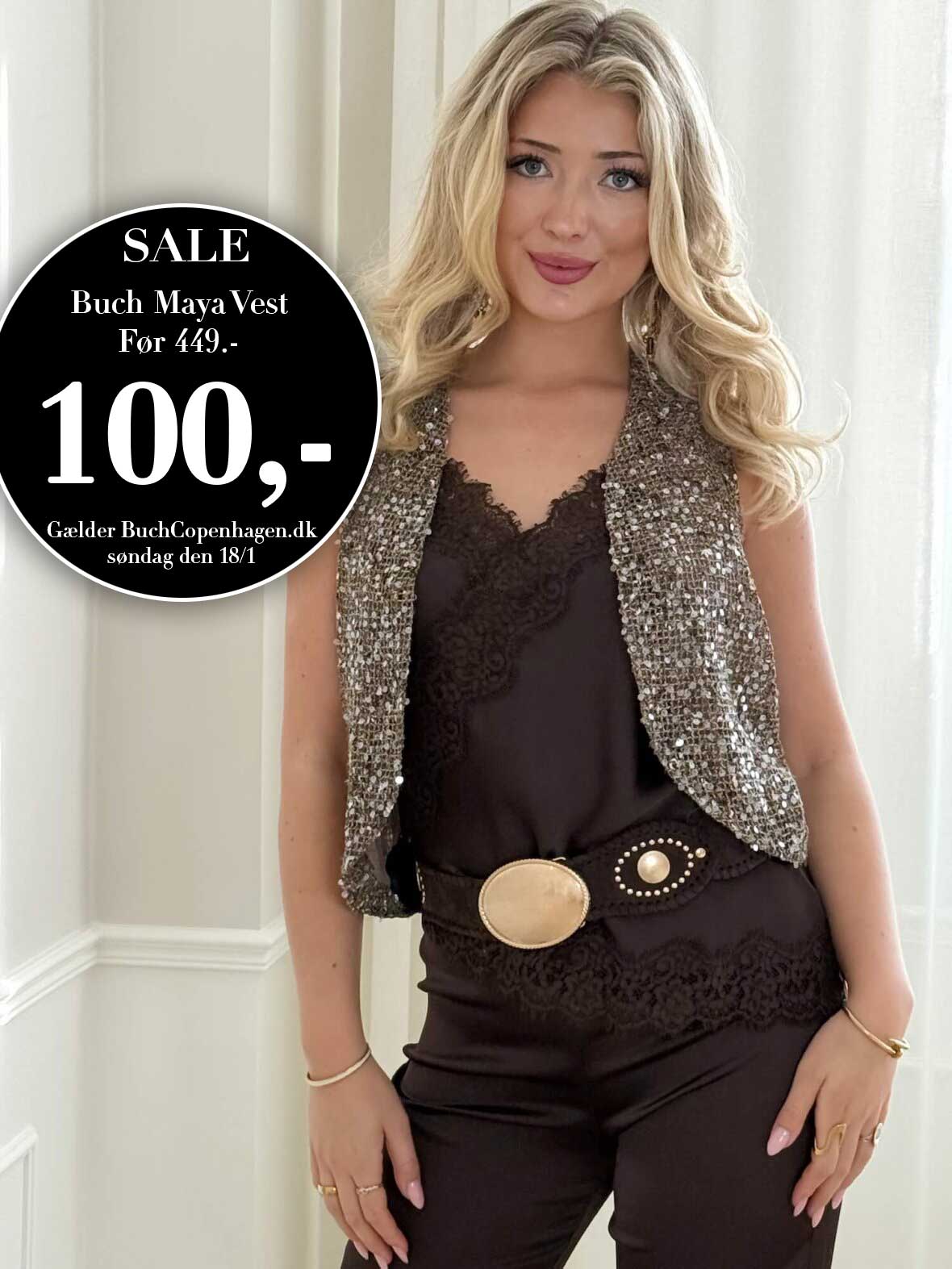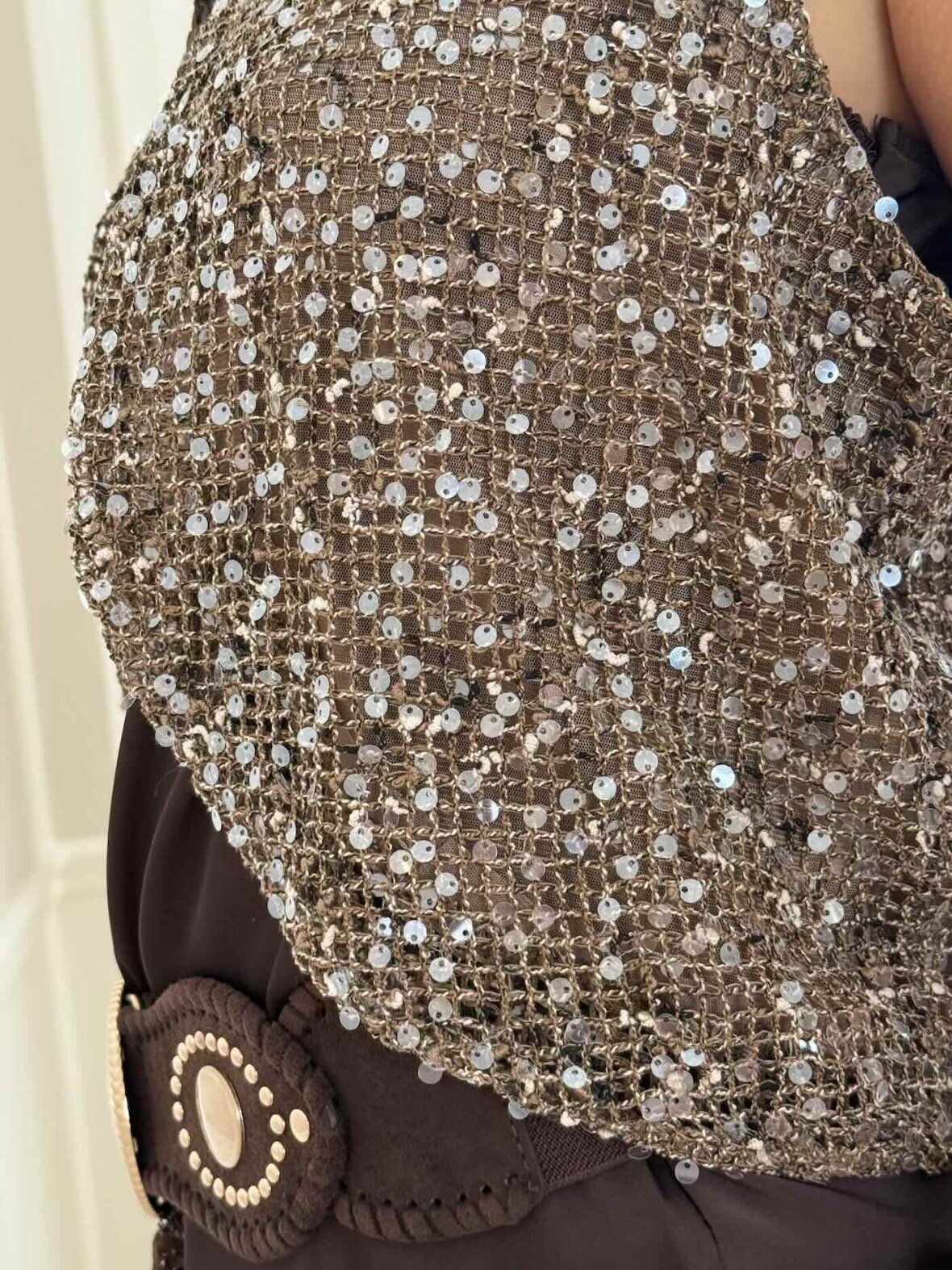 Smuk vest dækket af skinnende pailletter i en varm taupe nuance. Vesten har en elegant åben front og et let transparent look, der giver et sofistikeret og glamorøst udtryk. Perfekt til at style over en skjorte, kjole eller top for et eksklusivt touch.