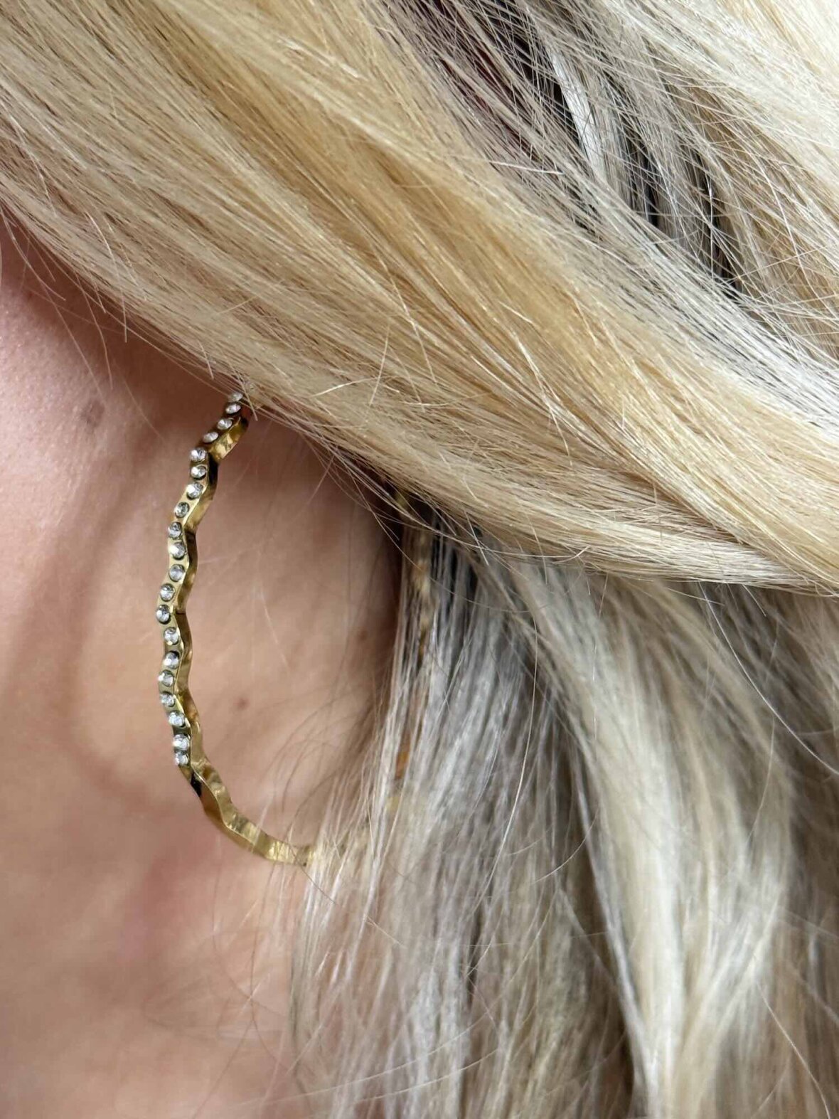 Elegante guldfarvede hoops med et bølget design og smukke indfattede sten på forsiden. Øreringene kombinerer klassisk glans med et moderne twist, der fanger lyset og tilfører et eksklusivt udtryk. Letvægtsdesign med kliklås, så de sidder sikkert og behageligt hele dagen. Perfekte til både hverdag og fest.