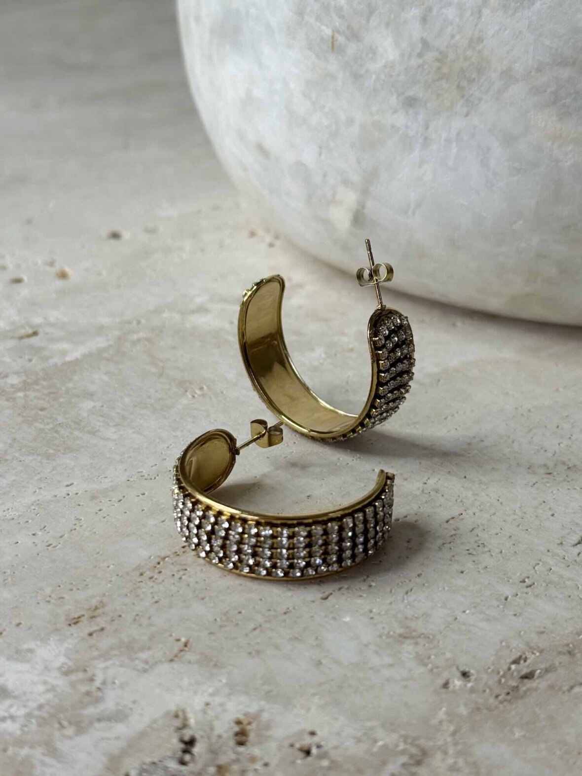 Elegante guldfarvede hoops med et bredt bånd af funklende klare sten. Øreringene har et eksklusivt og luksuriøst udtryk, der fanger lyset smukt fra alle vinkler. Deres solide design gør dem perfekte til både festlige lejligheder og hverdagsbrug, når du ønsker at tilføje et sofistikeret touch til dit look.