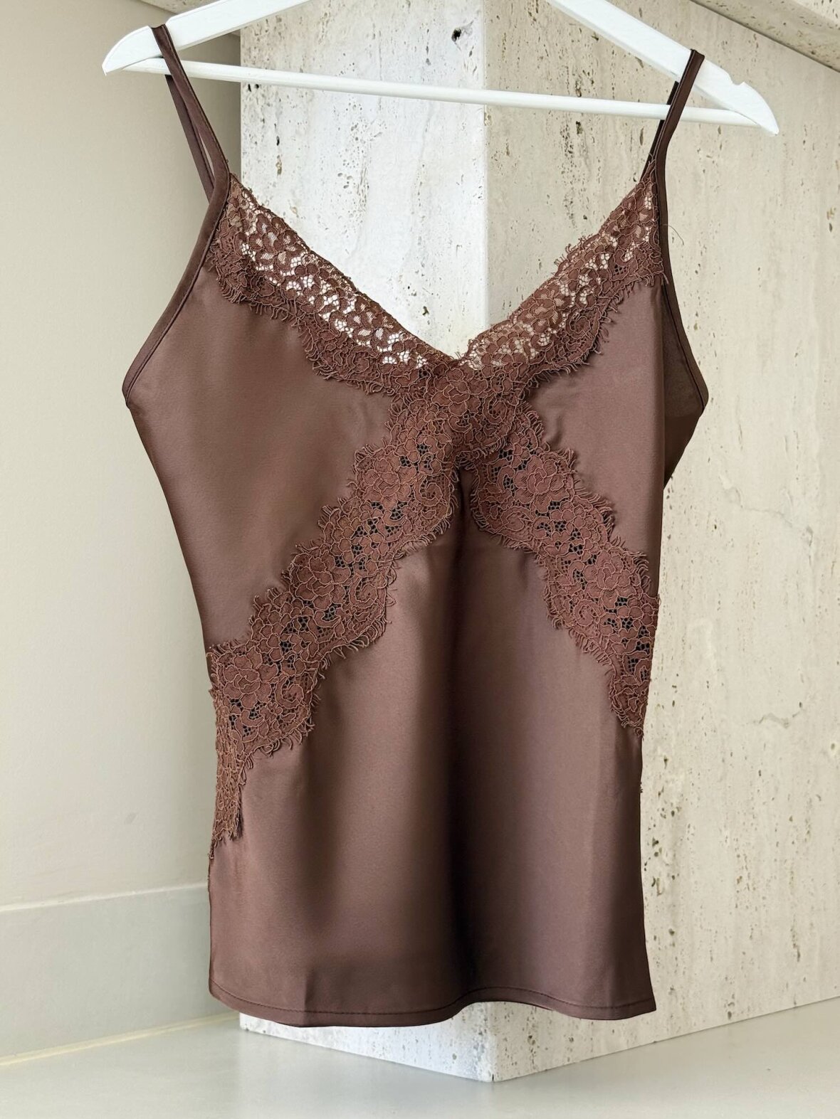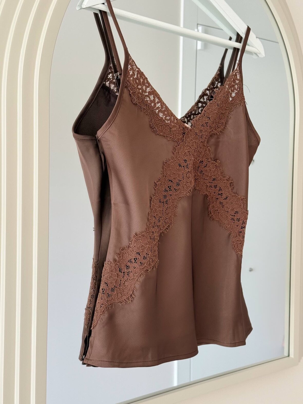 Smuk chokoladebrun top i satinlook med fine blondedetaljer foran og ved udskæringen. Toppen har justerbare stropper og et flatterende snit, der giver et elegant og feminint udtryk. Perfekt alene eller under en blazer.