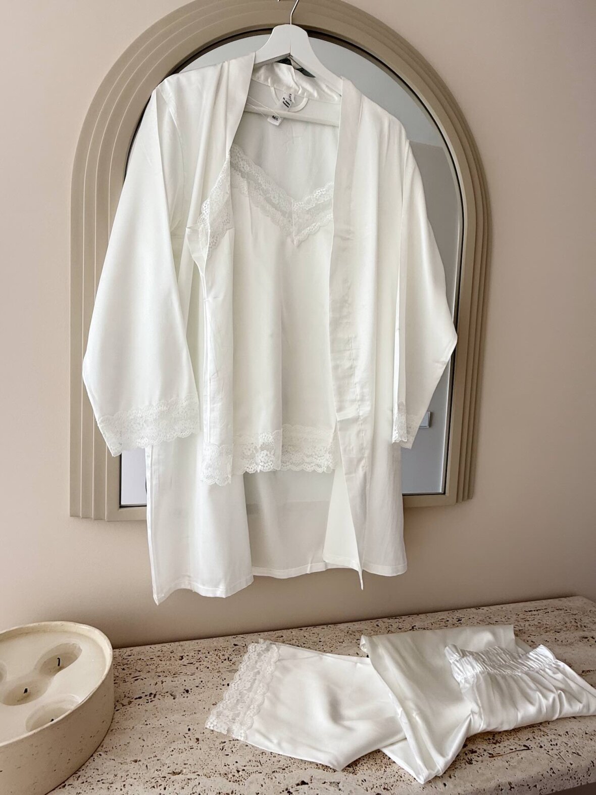 Elegant sæt i hvid satinlook bestående af kimono, blondetop og shorts. Sættet har feminine blondedetaljer, der giver et eksklusivt og romantisk udtryk. Perfekt som nattøj eller loungewear, når du ønsker komfort og stil på samme tid.