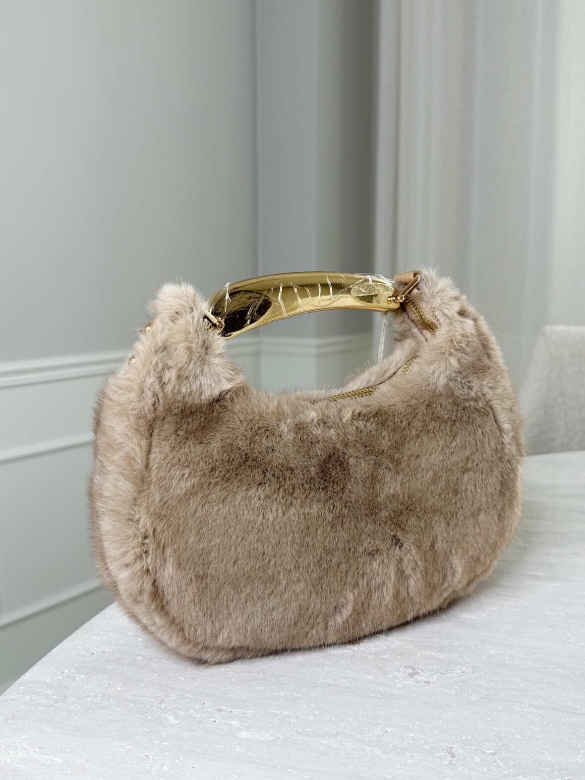 Smuk og eksklusiv taske i blød beige faux fur med elegante gulddetaljer. Tasken har et skinnende gyldent håndtag og en justerbar kæderem, som kan bruges både crossbody og over skulderen. Det varme beige miks med de gyldne nuancer giver et luksuriøst og feminint udtryk – perfekt til både hverdag og fest.