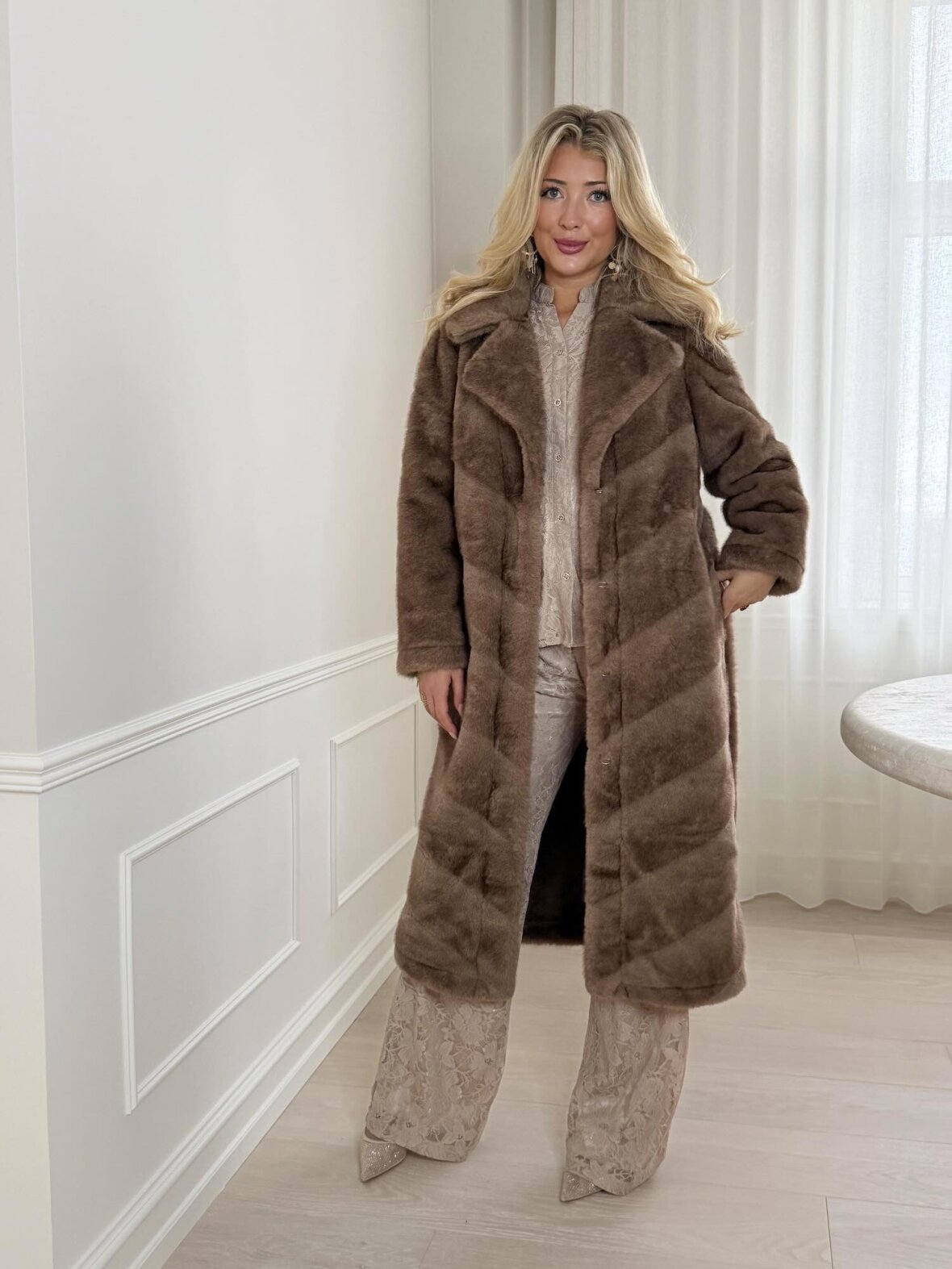 Luksuriøs faux fur frakke fra Buch Copenhagen i en smuk brun nuance. Frakken har bindebælte i taljen, brede revers og sidelommer for et elegant og eksklusivt look. Perfekt til efterår og vinter, hvor du vil holde varmen med stil og femininitet.