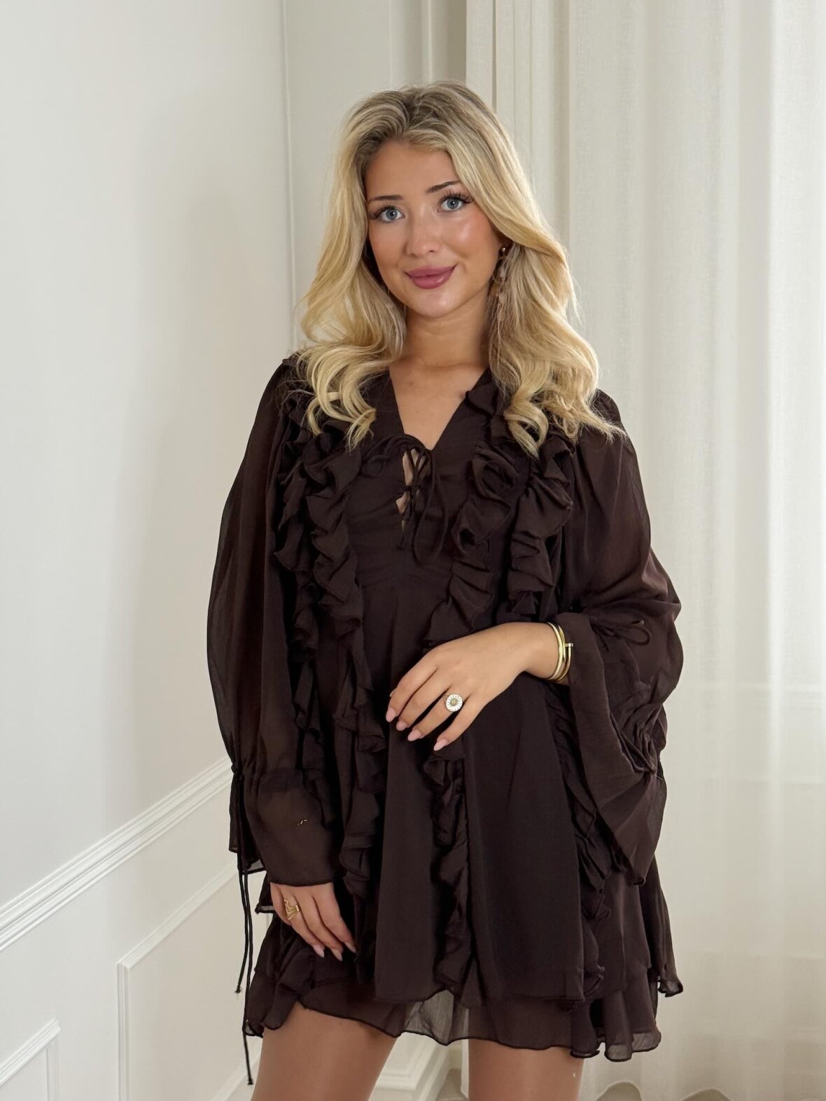 Elegant og feminin kjole i let chiffon med flæsedetaljer og bindebånd ved udskæringen. Kjolen har lange, transparente ærmer og en løs pasform, der falder smukt på kroppen. Den dybe chokoladebrune farve gør den perfekt til både efterårsfester og hyggelige aftener.