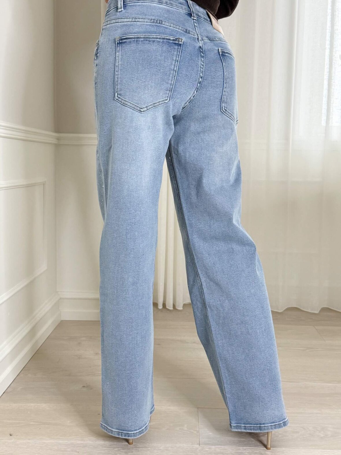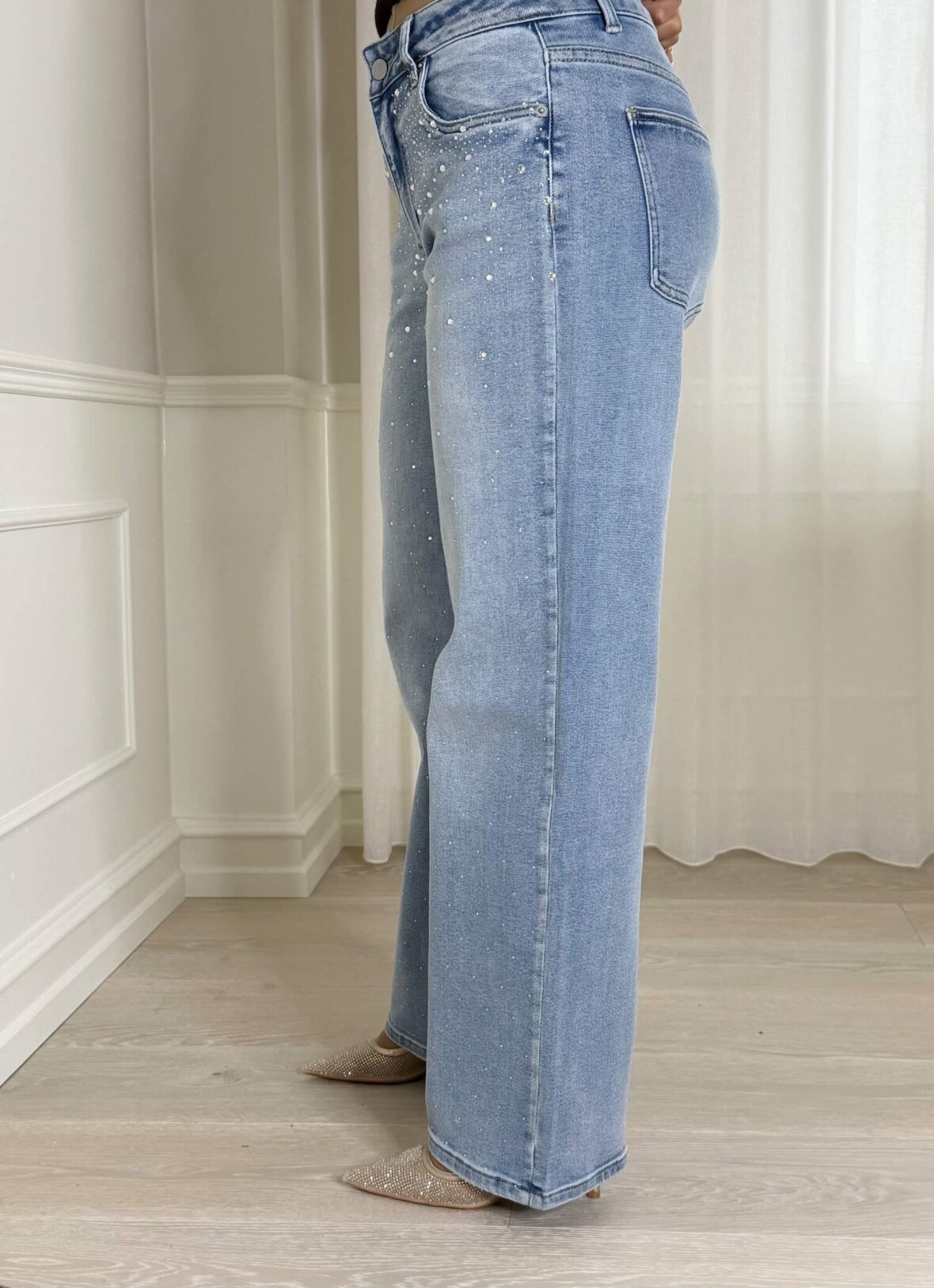 Lyseblå jeans med elegante krystalsten, der giver et eksklusivt og feminint udtryk. Designet har en løs pasform og høj talje, som både er flatterende og komfortabel. Perfekt til dig, der vil kombinere et cool denimlook med et strejf af glamour – ideel til både hverdag og fest.