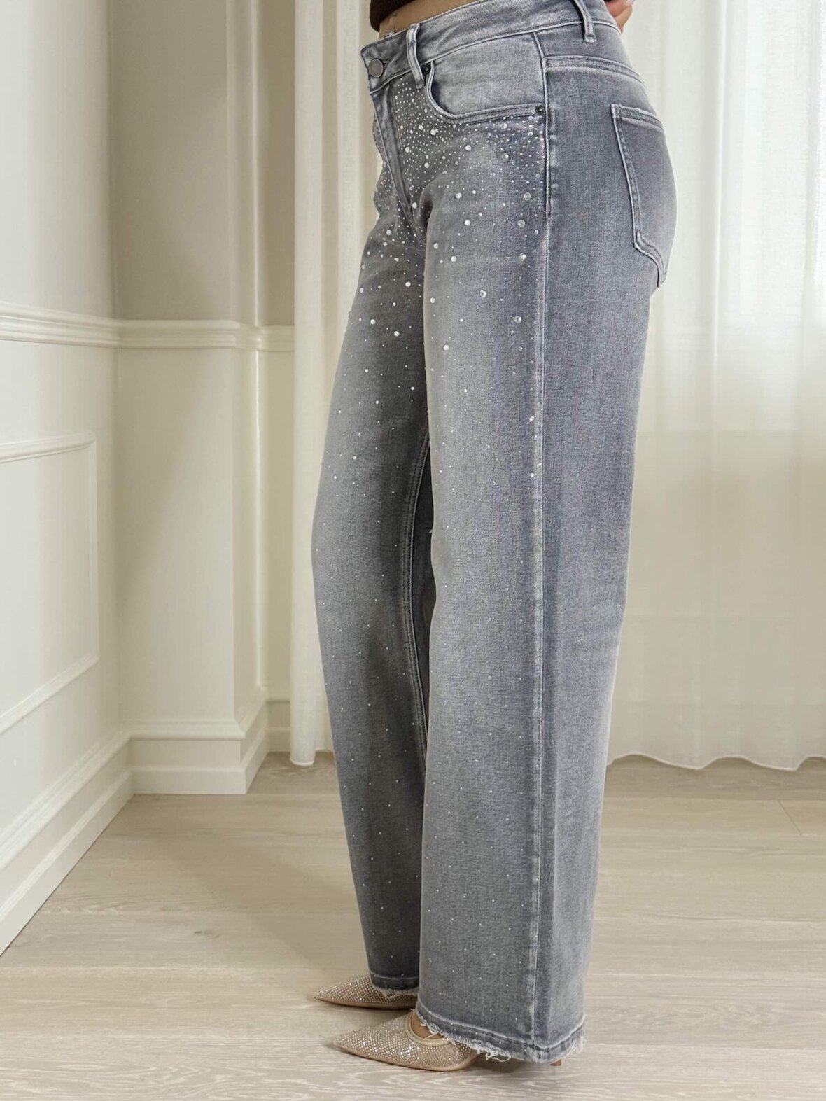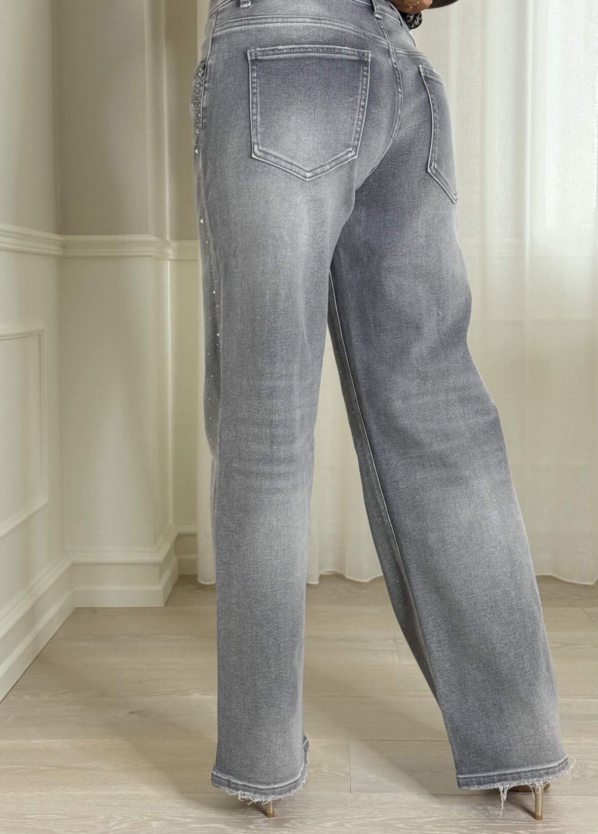 Grå jeans med høj talje og smukke krystalsten, der giver et glamourøst touch. Den løse pasform kombineret med det eksklusive design gør dem perfekte til både hverdagsbrug og festlige lejligheder. Style dem med en enkel top eller strik for et sofistikeret og cool look.