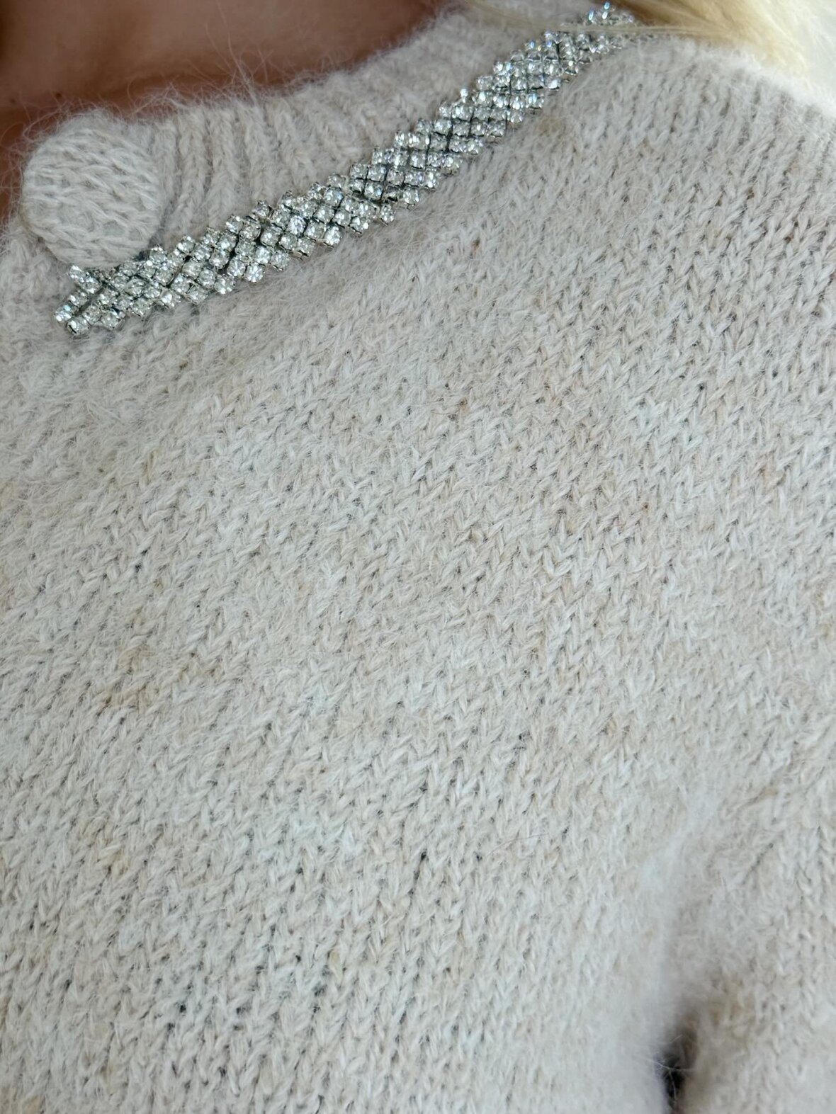 Blød og lækker cardigan i en varm beige nuance med store tone-i-tone knapper og en smuk perledetalje ved halsen. Den har et klassisk snit og en feminin elegance, der gør den ideel til både jeans og nederdel. En tidløs style til både hverdag og fest.