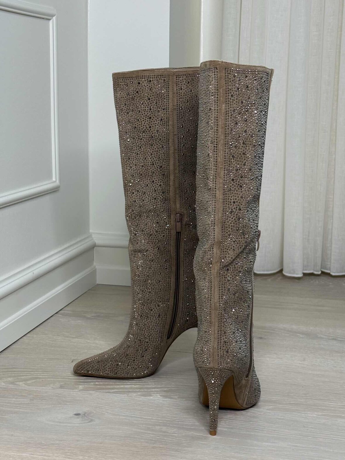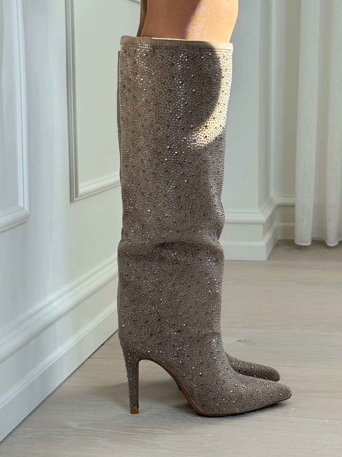 Disse eksklusive lange støvler fra Buch Copenhagen er dækket af funklende sten, der fanger lyset ved hvert skridt. Med en elegant spids snude, høj hæl og blød pasform kombinerer de glamour og komfort. Perfekte til både festlige lejligheder og elegante hverdagslooks.