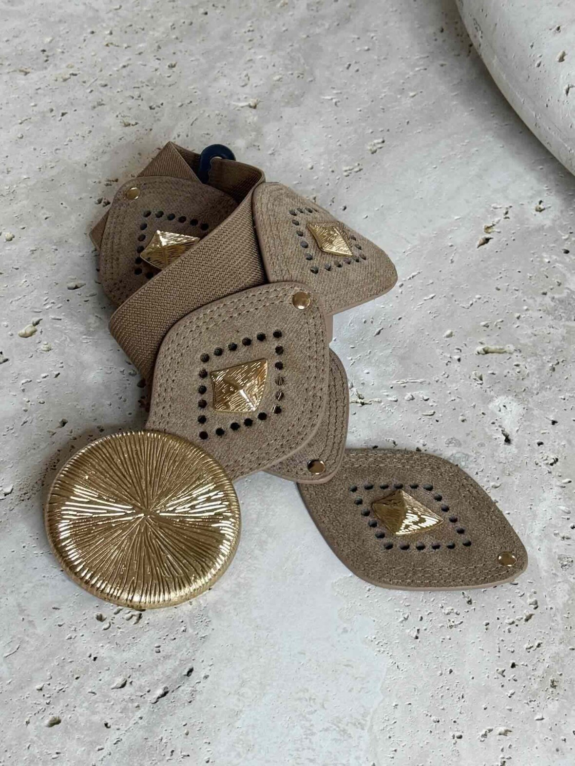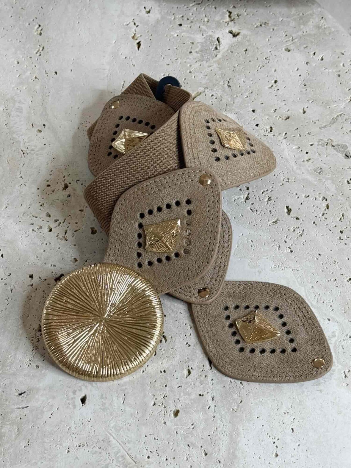 Taupe elastikbælte med unikke gulddetaljer og dekorative geometriske former. Det fleksible design gør bæltet både komfortabelt og flatterende, mens det gyldne spænde tilføjer et eksklusivt touch. Perfekt til at fremhæve taljen på kjoler, skjorter eller strik – et elegant statement-accessory til enhver lejlighed.