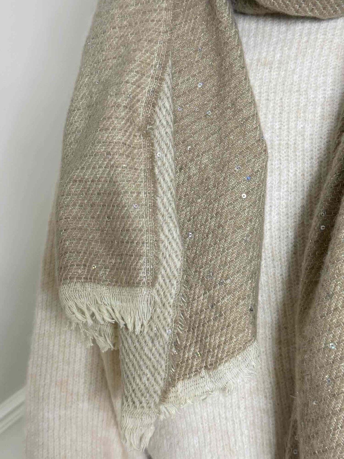 Blødt tørklæde i beige nuance med et let skinnende vævemønster. Den luksuriøse struktur og neutrale farve gør det nemt at style til både hverdag og fest. Perfekt til at give dit outfit et elegant og varmt touch – uanset årstid.