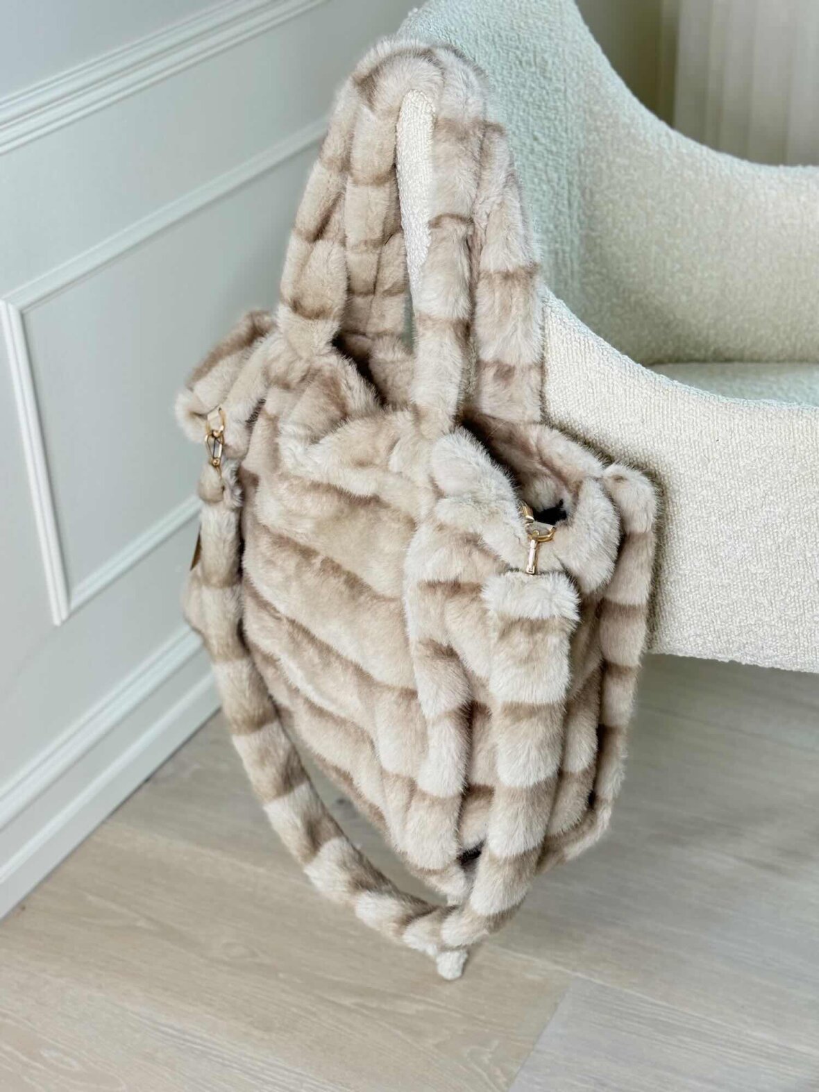 Eksklusiv beige faux fur-taske med smukt, blødt pelset look og luksuriøs struktur. De brede hanker gør den komfortabel at bære, og den rummelige form giver plads til hverdagens essentials. En feminin og elegant vintertaske, der løfter ethvert outfit med sit varme og stilfulde udtryk.