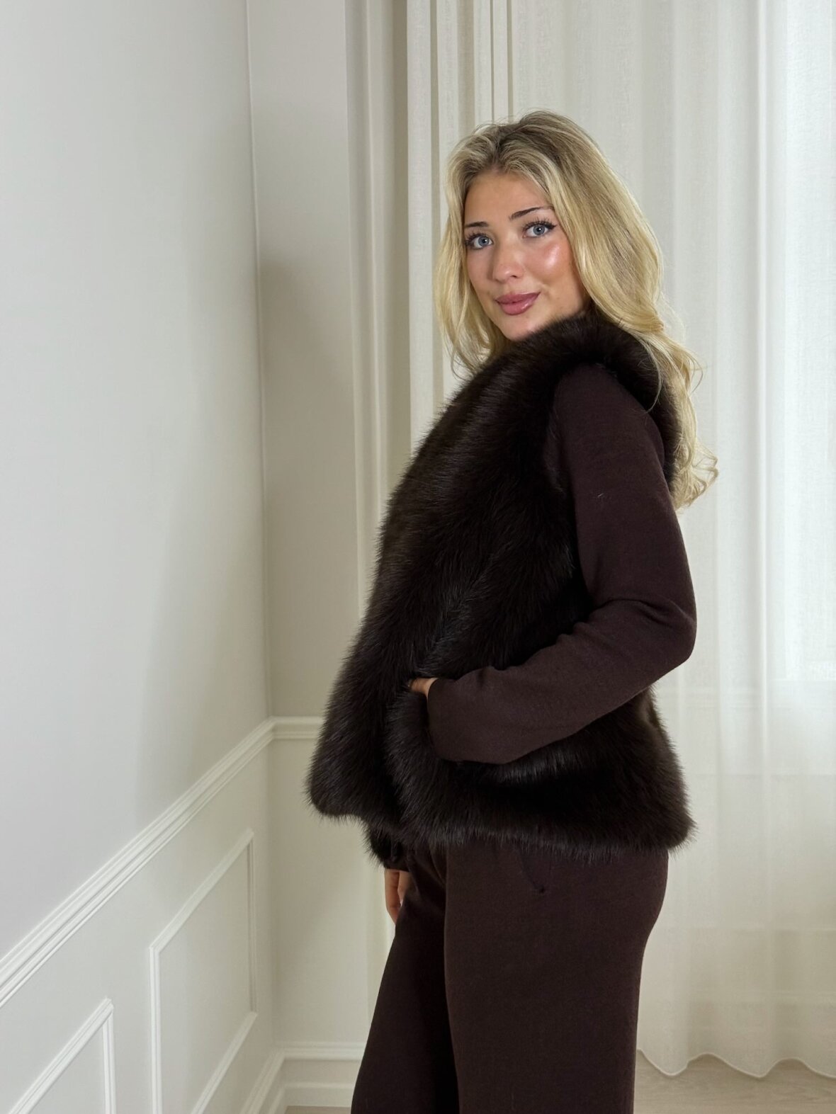 Luksuriøs faux fur vest i dyb chokoladebrun farve med et elegant, glansfuldt udtryk. Den bløde pels giver både varme og stil, perfekt til lag-på-lag over kjoler, skjorter eller strik. En tidløs og eksklusiv tilføjelse til garderoben, der løfter ethvert outfit.