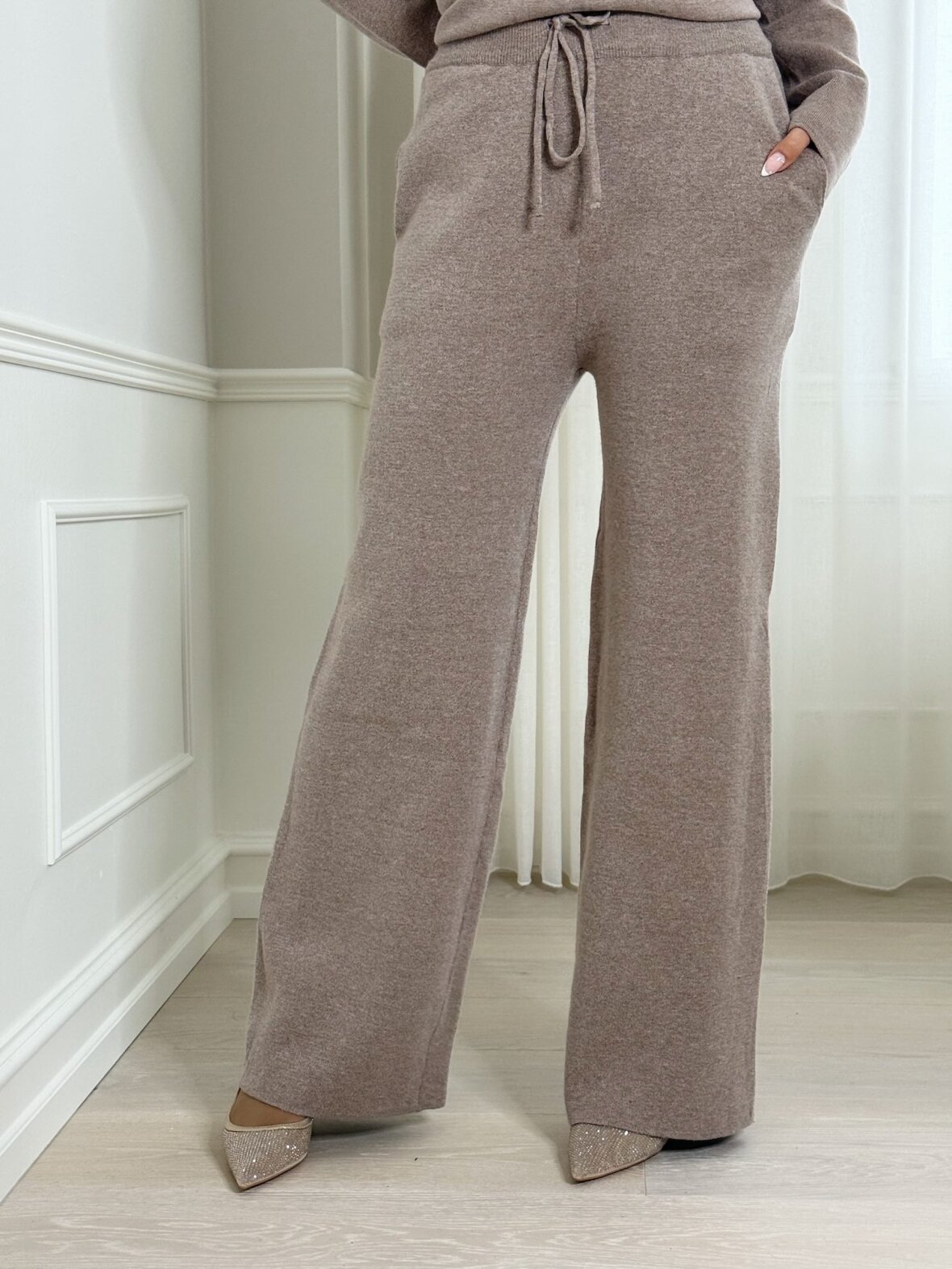 Komfortable og stilrene strikbukser i elegant taupefarve. Bukserne har elastisk talje med snøre og en løs, flatterende pasform, der giver et luksuriøst og afslappet udtryk. Perfekte både hjemme og ude – kombiner med matchende strik for et harmonisk og sofistikeret look.