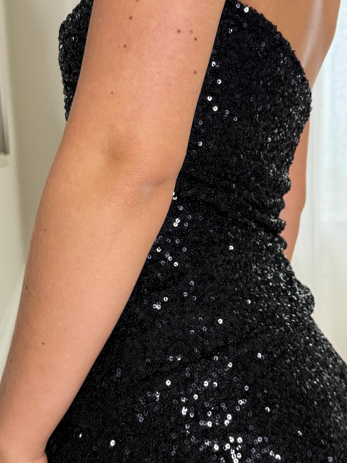 Elegant sort paillet bias top med asymmetrisk længde, hvor den ene side falder smukt længere end den anden. Den tætsiddende pasform og glamourøse glans skaber et moderne og sofistikeret look. Perfekt til festlige anledninger og flot sammen med matchende bukser. En eksklusiv statement-top fra Buch Copenhagen.