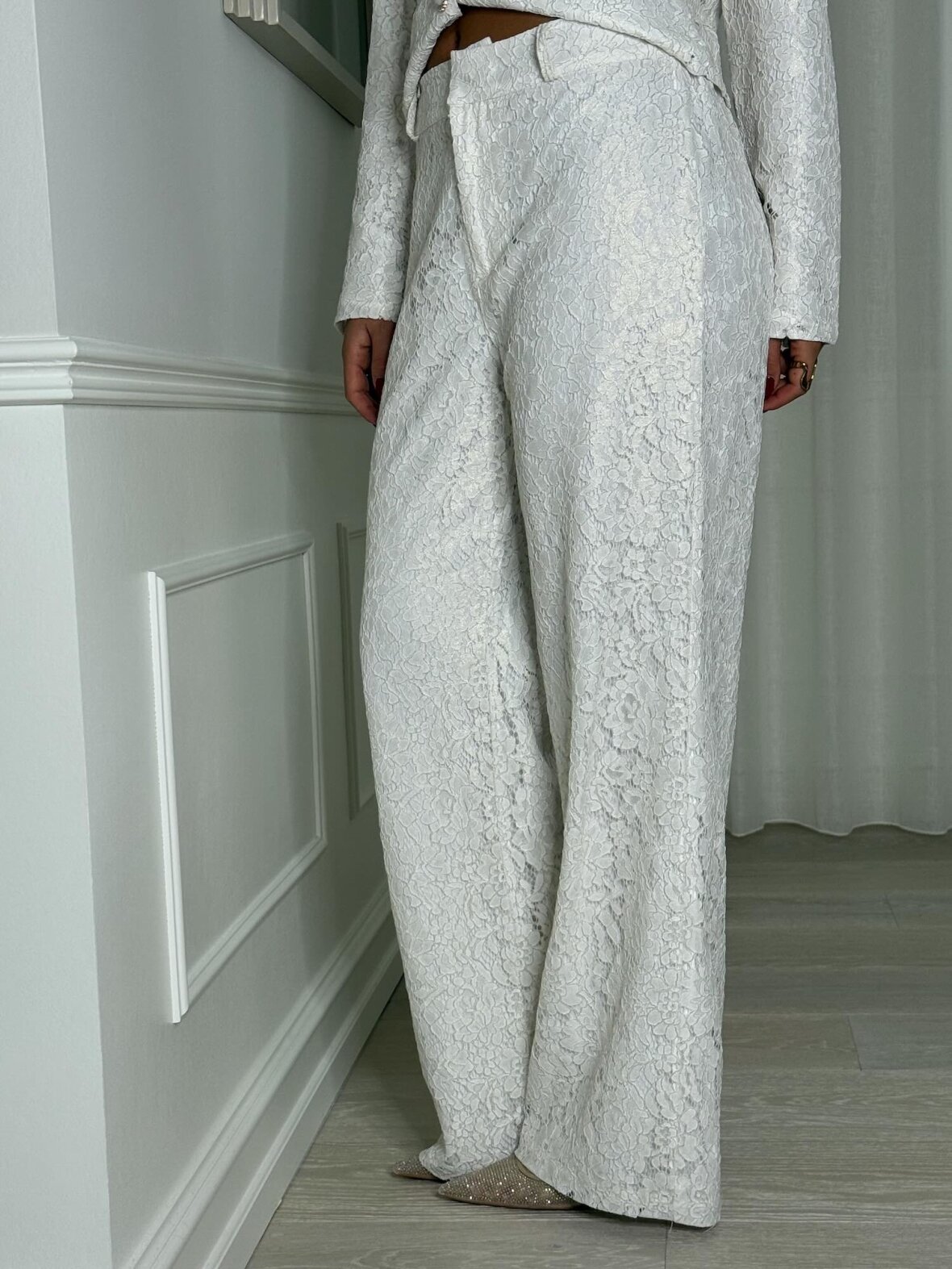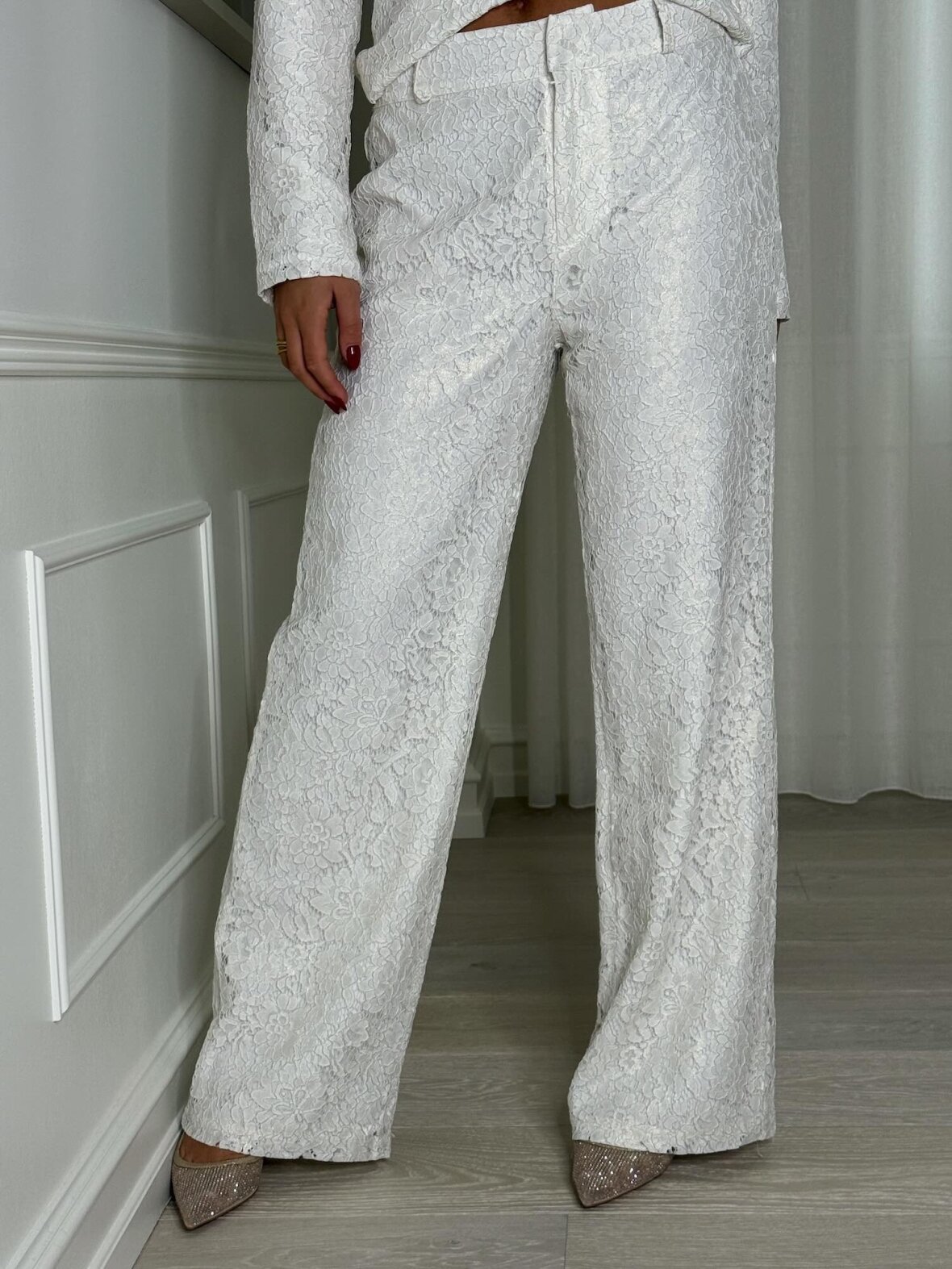 Elegante hvide blondebukser med smuk struktur og let vidde, der skaber et feminint og sofistikeret udtryk. Den bløde pasform og eksklusive blonde gør dem perfekte til både festlige anledninger og stilfulde hverdagslooks. Match dem med tilhørende blondejakke for et tidløst, luksuriøst sæt fra Buch Copenhagen.