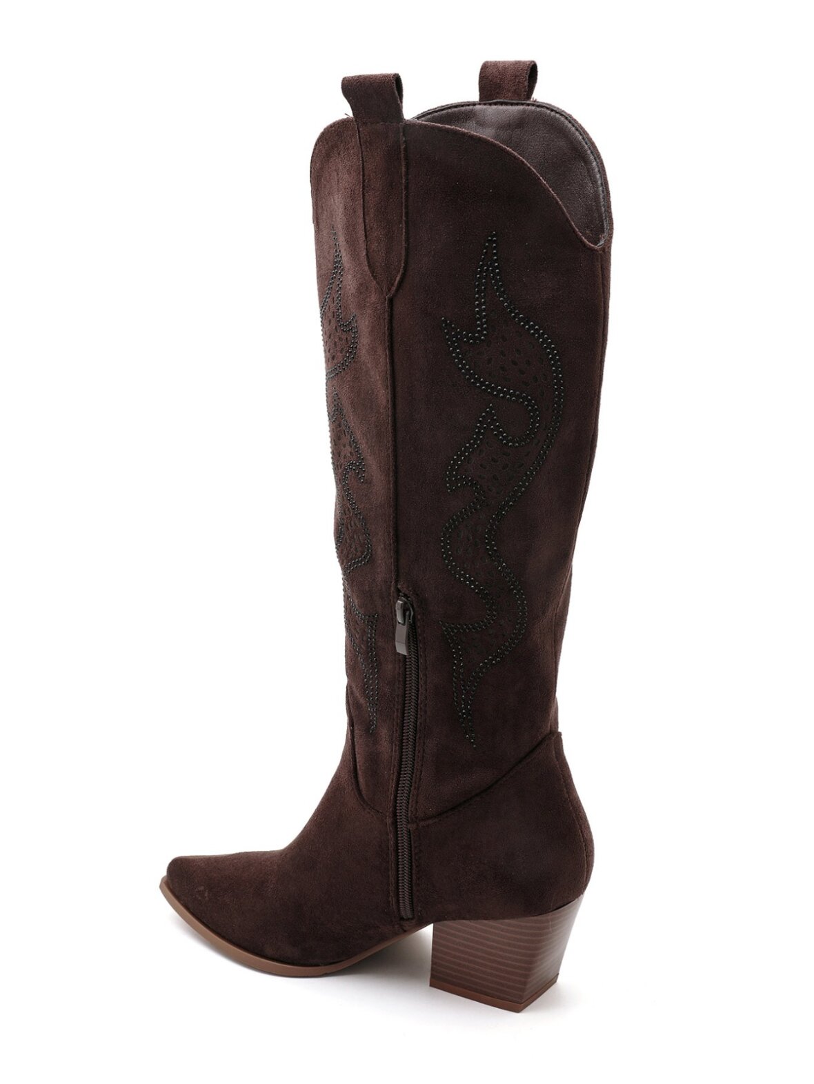 Elegante cowboy-støvler i mørk chokoladebrun suede-look med smukke western-detaljer. Den stabile blokhæl giver komfort, mens den spidse snude skaber et feminint og eksklusivt udtryk. Perfekte til kjoler, nederdele og slim jeans, når du ønsker et stilrent Buch Copenhagen look med et moderne twist.