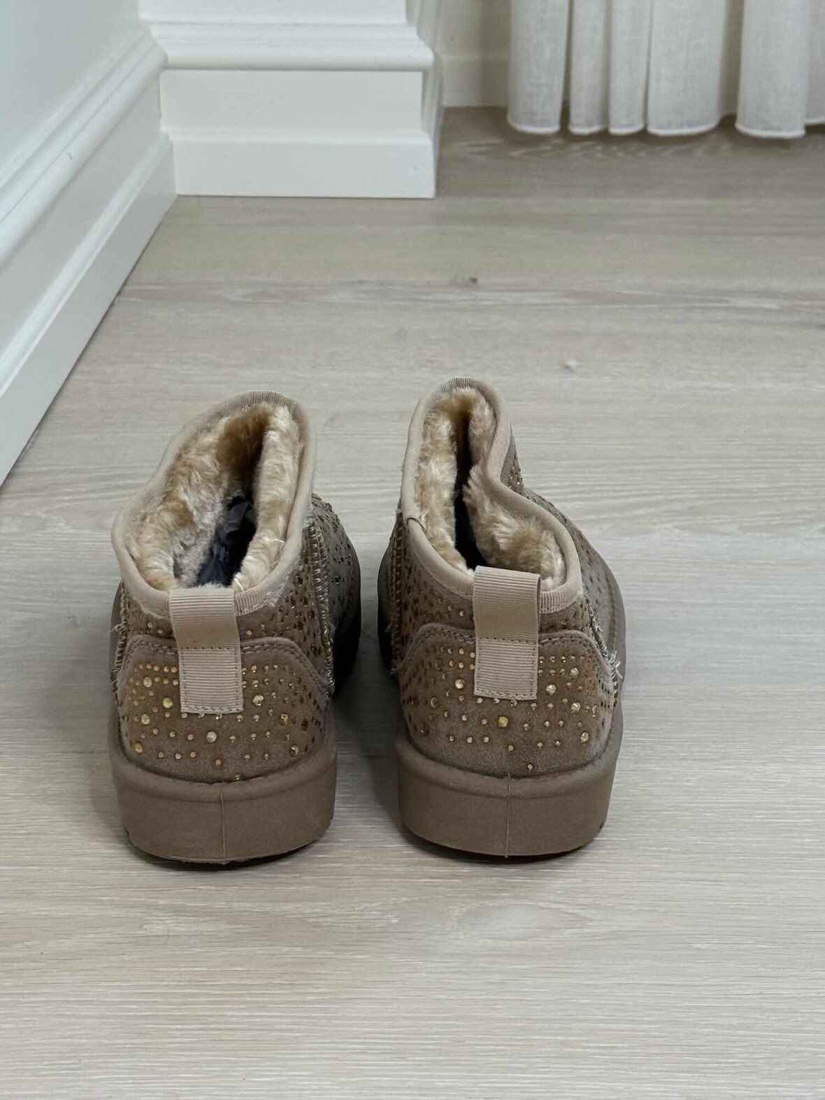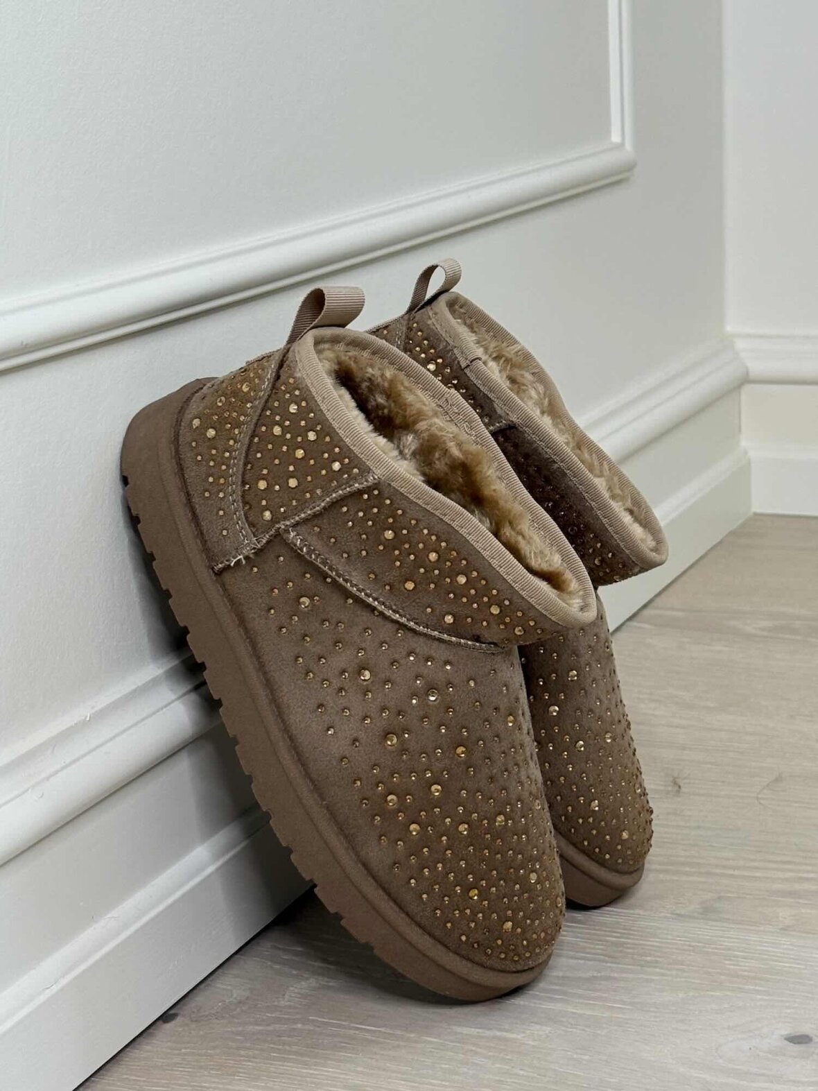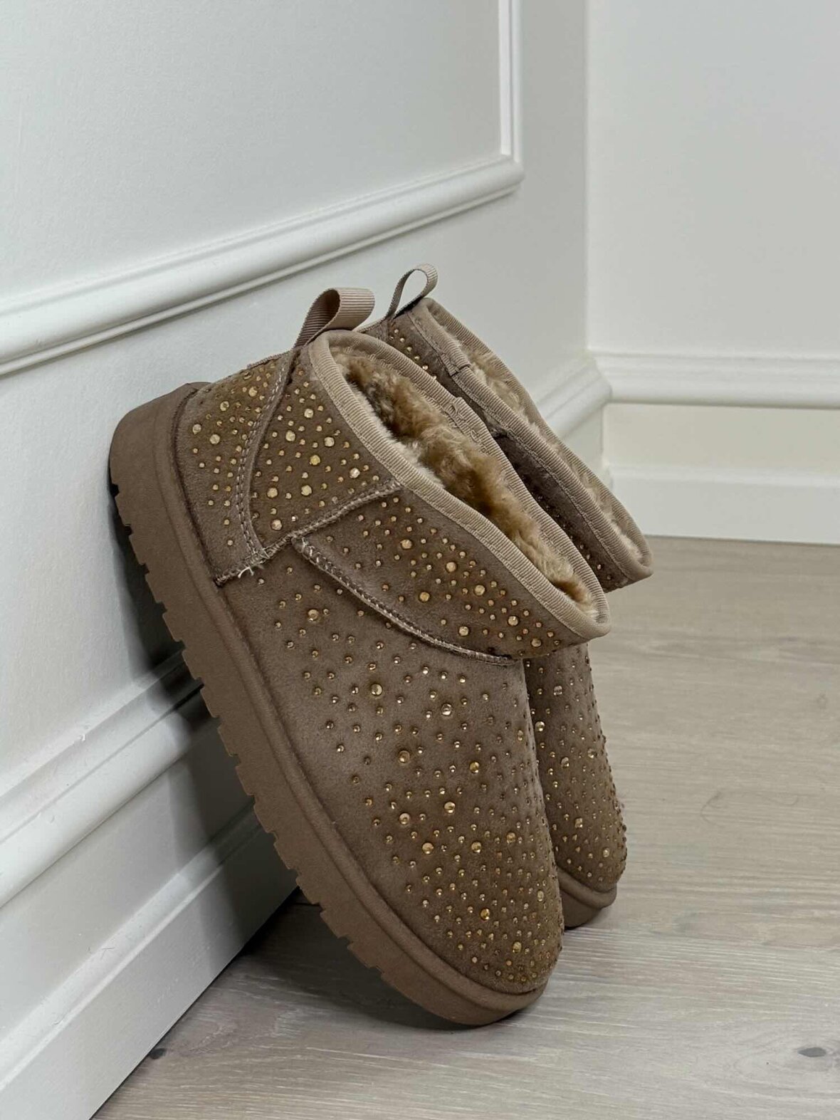 Varme og stilfulde khaki vinterstøvler med blød faux fur-foring, der giver maksimal komfort. De fine guldfarvede studs tilfører et feminint og eksklusivt touch, mens den solide sål gør dem ideelle til både inde- og udendørs brug. Et perfekt valg til kolde dage med fokus på både stil og funktion.