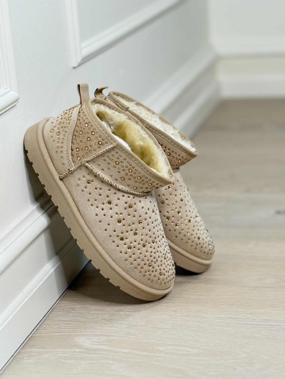 Disse beige vinterboots kombinerer luksuriøs varme med et elegant design. De bløde, forede indersider sikrer komfort, mens de fine guldnitter tilfører et eksklusivt udtryk. Den solide sål giver stabilitet, og den lave profil gør dem perfekte til både hverdagsbrug og hyggelige vinterdage. Et feminint og stilfuldt valg.
