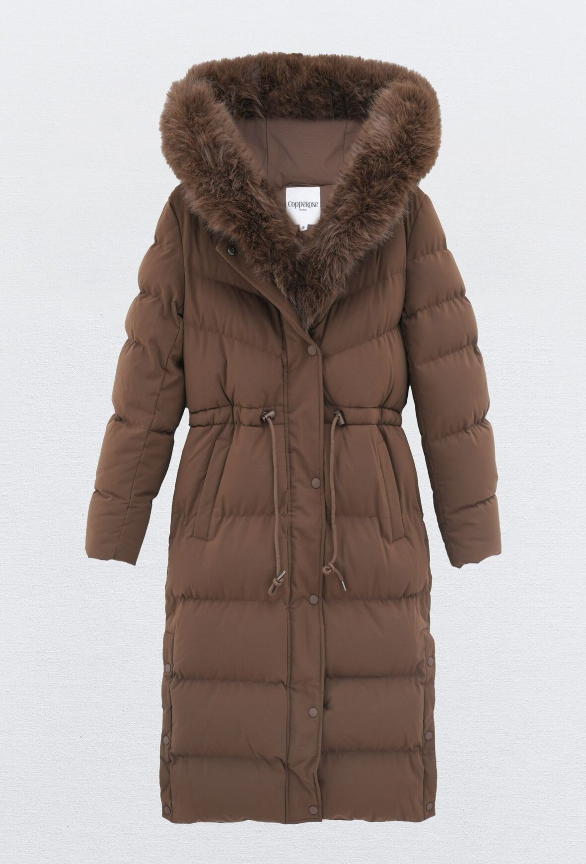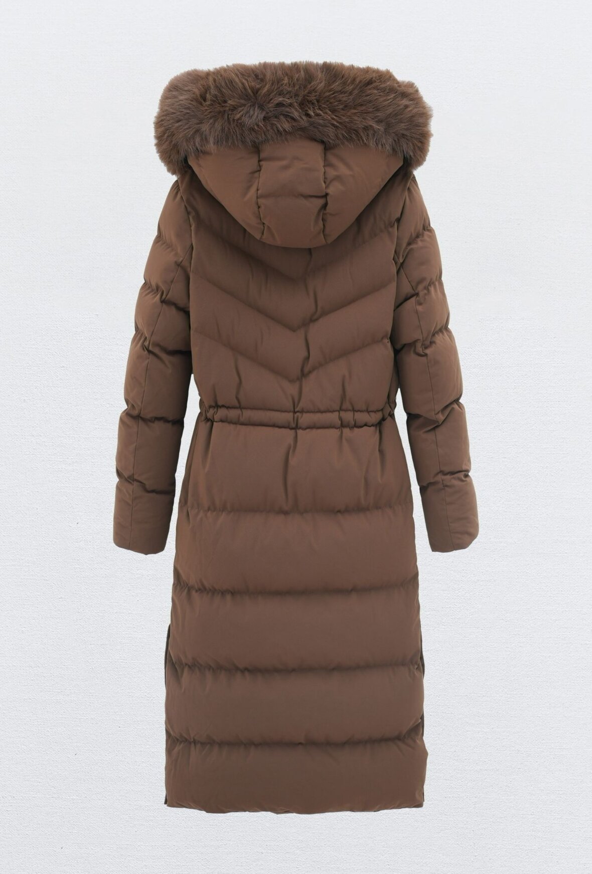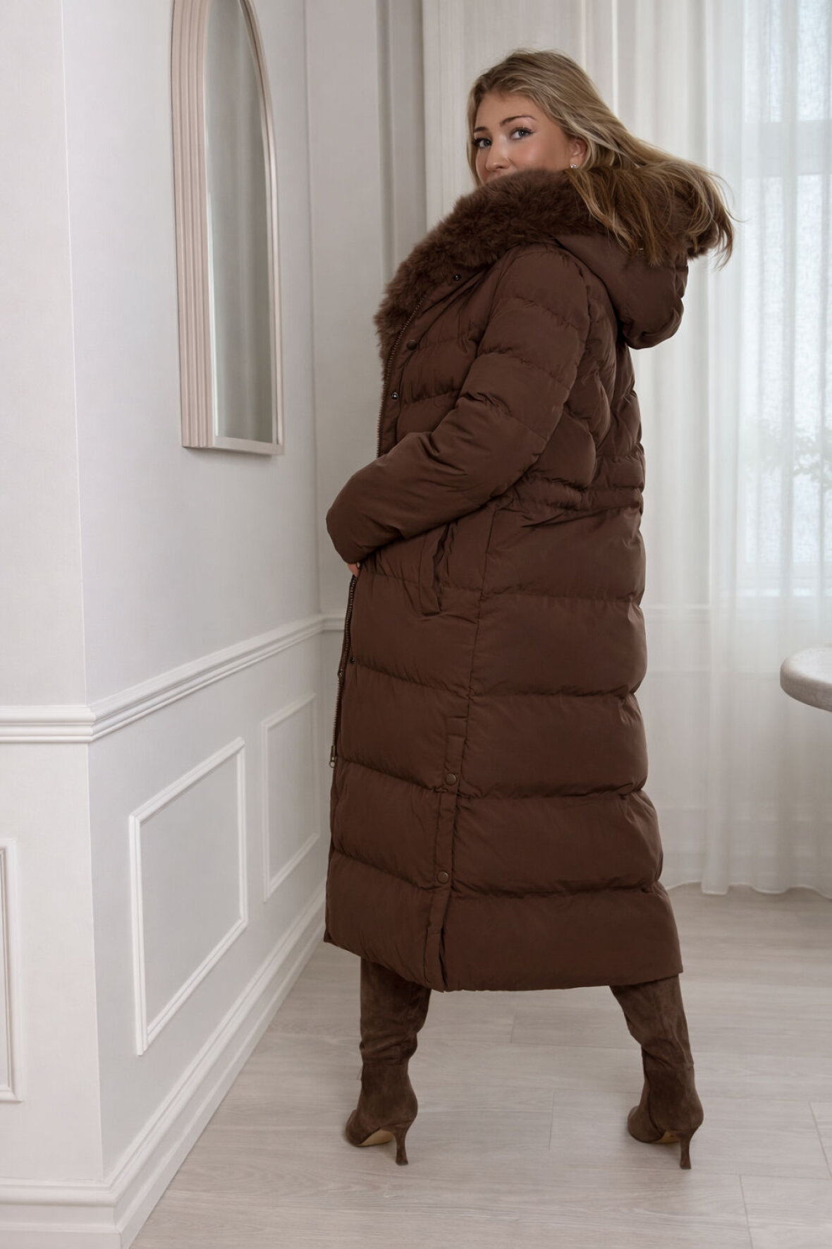 Eksklusiv lang chokolade dunjakke med med aftagelig og fyldig faux fur-krave, der giver et elegant og varmt vinterudtryk. Jakken har en smuk, feminin pasform med tovejslynlås og trykknapper for fleksibilitet. Det bløde, kraftige materiale sikrer maksimal komfort. Perfekt til både hverdag og vinterens festlige looks.