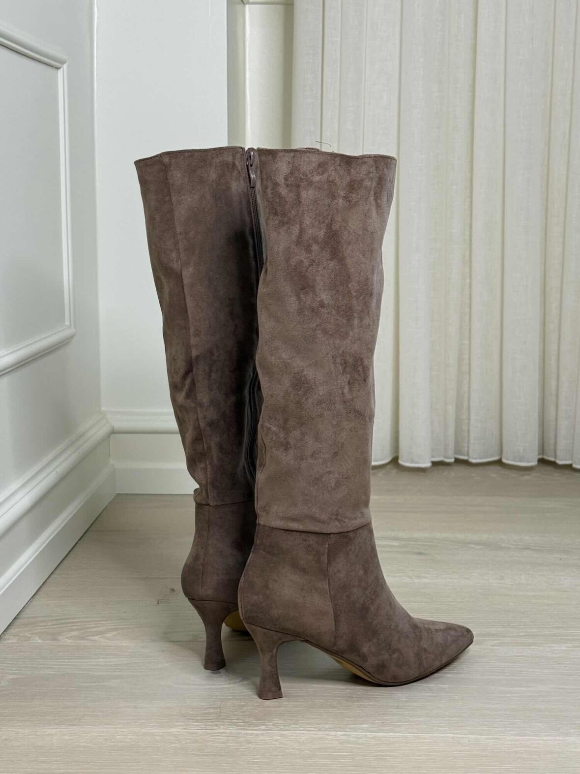 Smukke knæhøje støvler i blød khaki ruskind med elegant spids snude og slank hæl, der giver et feminint og sofistikeret udtryk. Den diskrete lynlås gør dem lette at tage på, og pasformen om benet er flatterende. Perfekte til både kjoler og jeans for et stilrent efterårs- og vinterlook.
