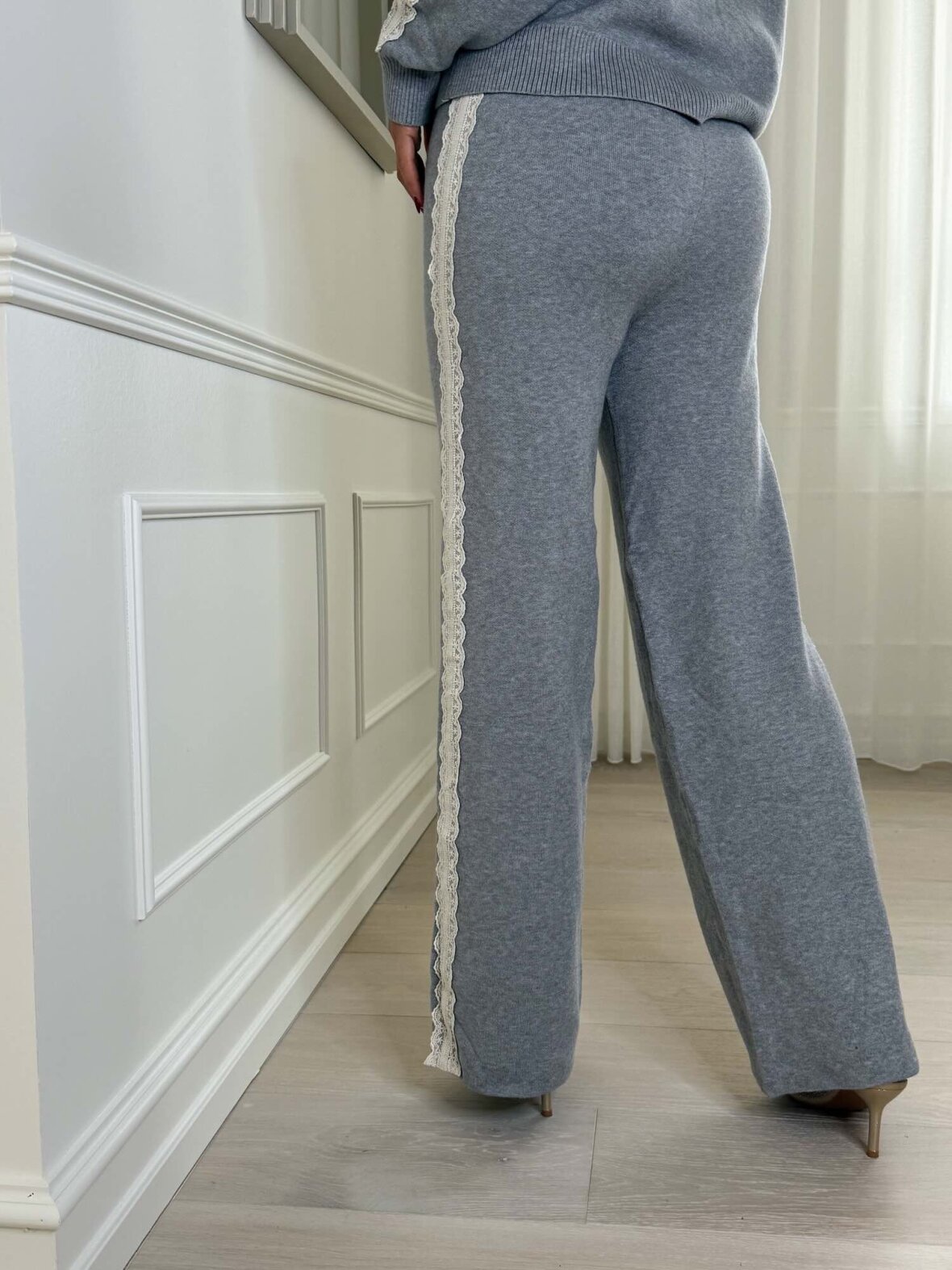 Bløde grå loungbukser med smukke blondekanter langs siderne, der giver et feminint og eksklusivt udtryk. Bukserne har elastik og justerbar snøre i taljen for perfekt pasform. Det brede ben skaber et elegant fald, og materialet føles komfortabelt hele dagen – ideelle til både hjemmehygge og afslappet hverdagsstil.