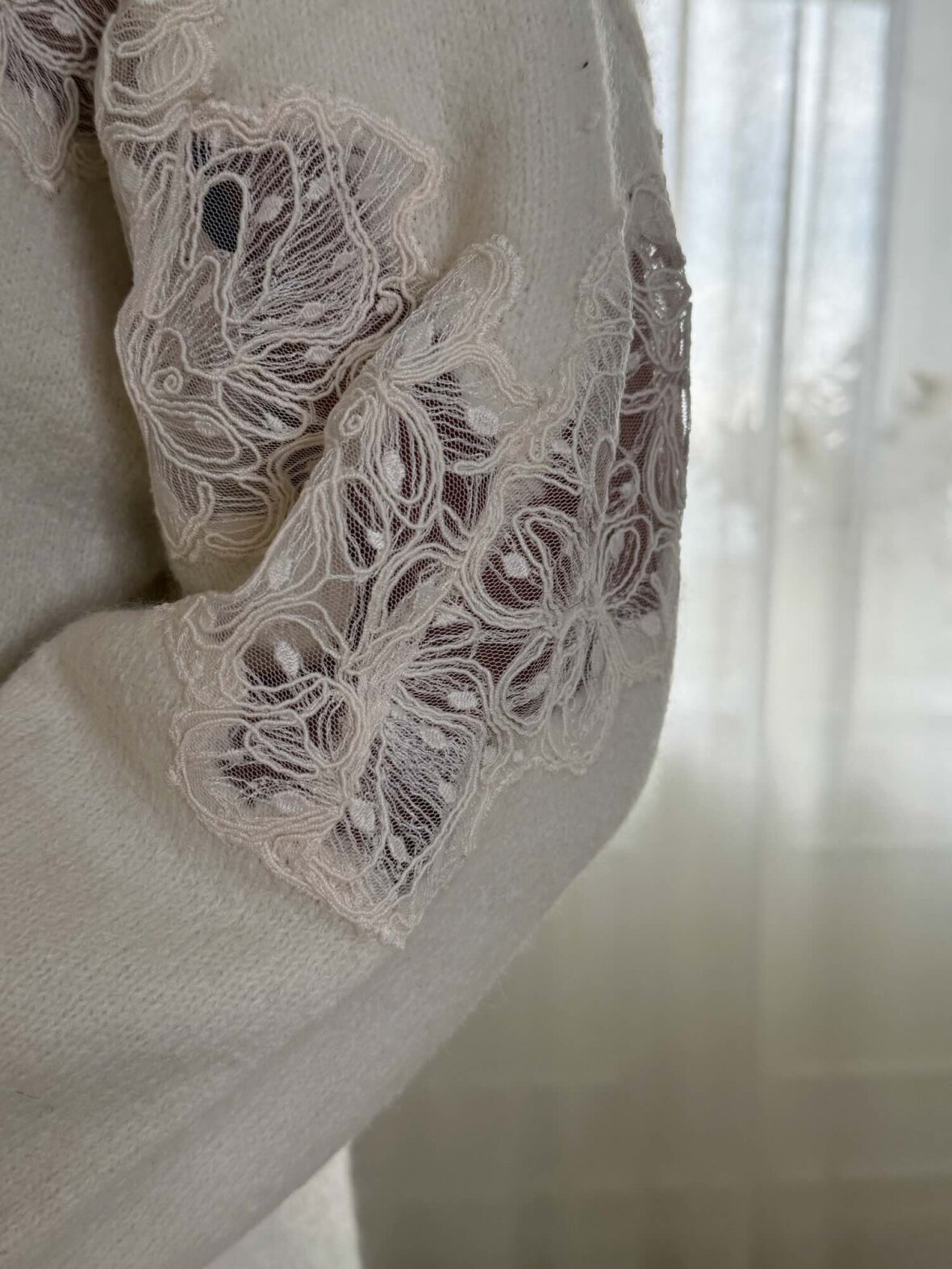 Smuk cremefarvet strikkjole med elegante blondedetaljer hen over bryst og ærmer. Den bløde, varme kvalitet giver maksimal komfort, mens det feminine design skaber et eksklusivt og romantisk look. Perfekt både til hverdag og hyggelige dage hjemme, stylet med støvler eller strømpebukser.