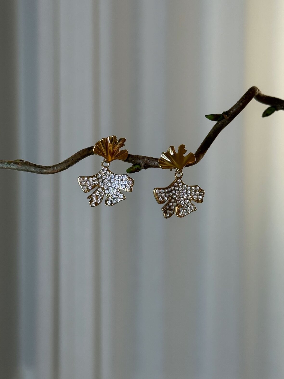 Elegante guldbelagte øreringe formet som blade med funklende klare krystaller. Det feminine og eksklusive design giver et luksuriøst touch til både hverdag og fest. Perfekte til at løfte ethvert Buch Copenhagen outfit med glamour, glød og raffineret detalje.