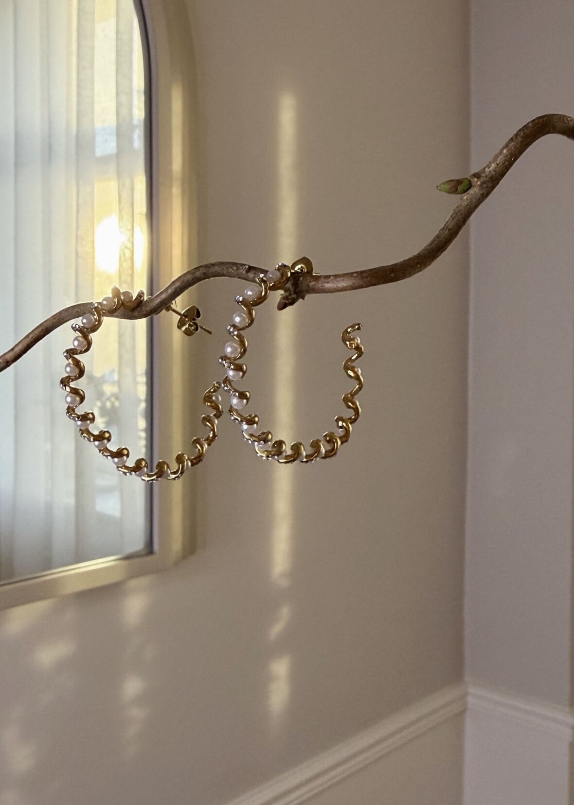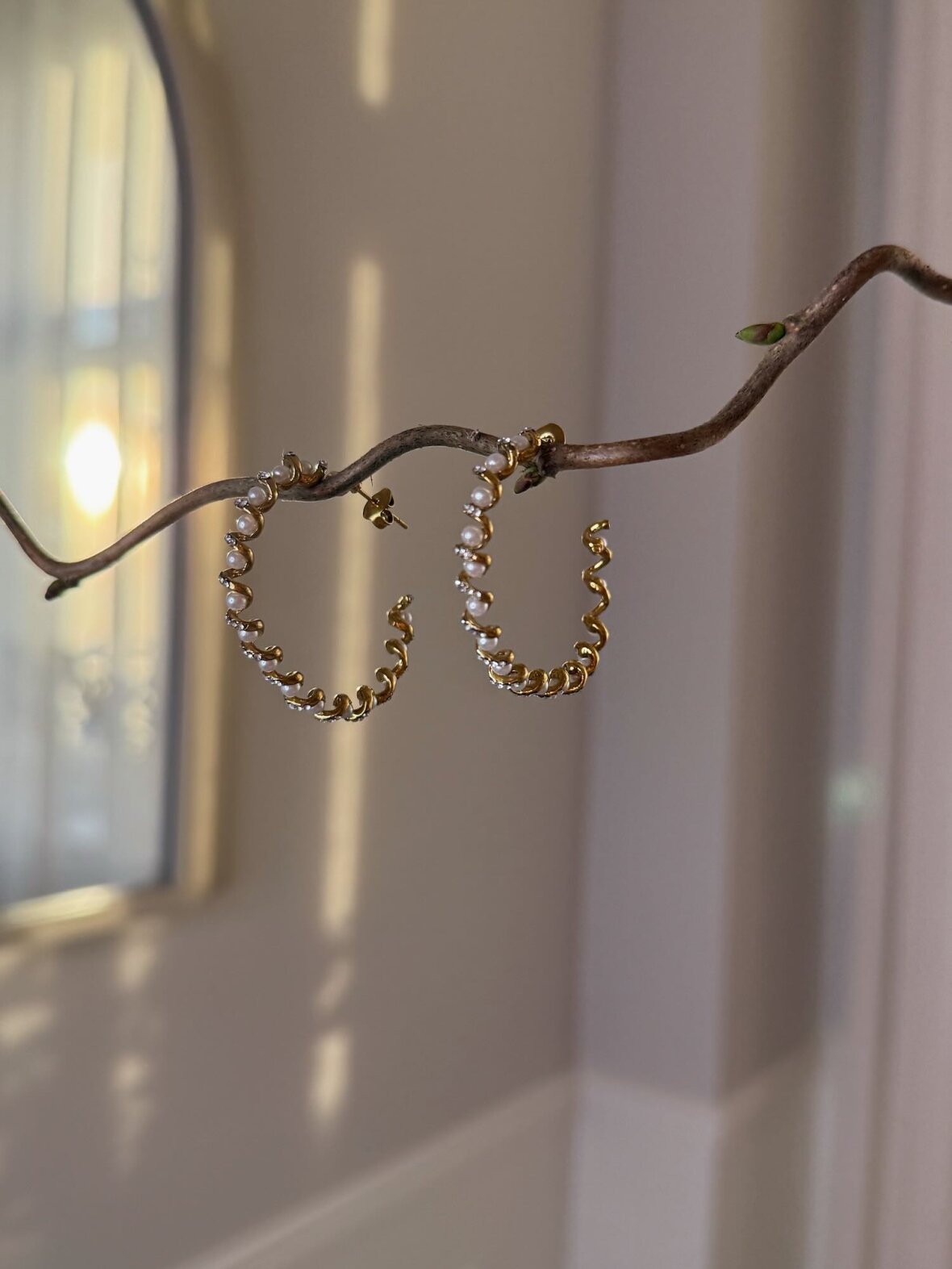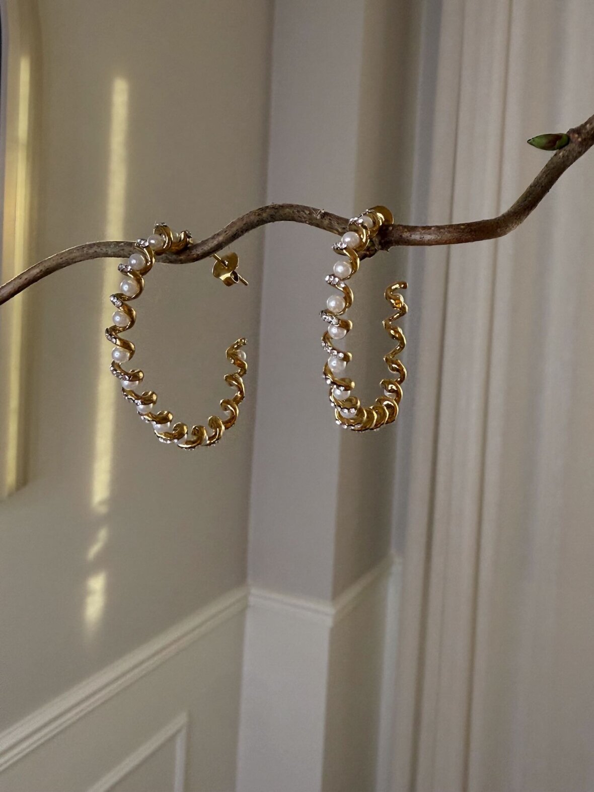 Elegante guldbelagte stainless steel hoops med fine perler og snoede detaljer, der giver et eksklusivt og feminint udtryk. De smukke perler fanger lyset og tilfører et luksuriøst touch til både hverdag og fest. Et tidløst og stilrent smykke, der løfter enhver styling.