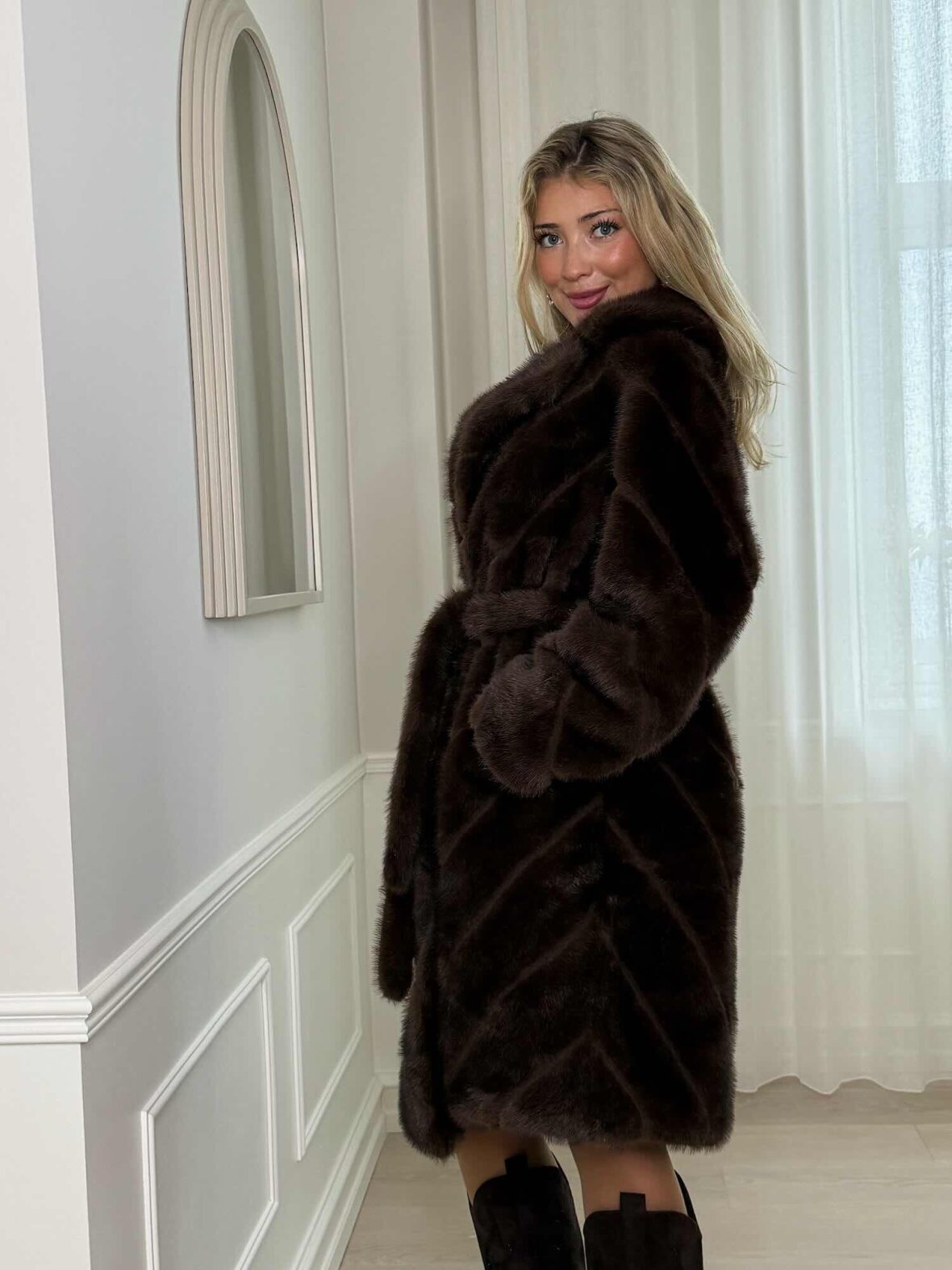 Eksklusiv chokoladebrun faux fur-frakke med smukt mønstret struktur og fyldig krave, der giver et elegant og varmt vinterlook. Den bløde kvalitet falder flot om kroppen, og det medfølgende bindebælte fremhæver taljen feminint. Perfekt til både festlige outfits og hverdagsbrug, når du ønsker maksimal luksus og komfort.