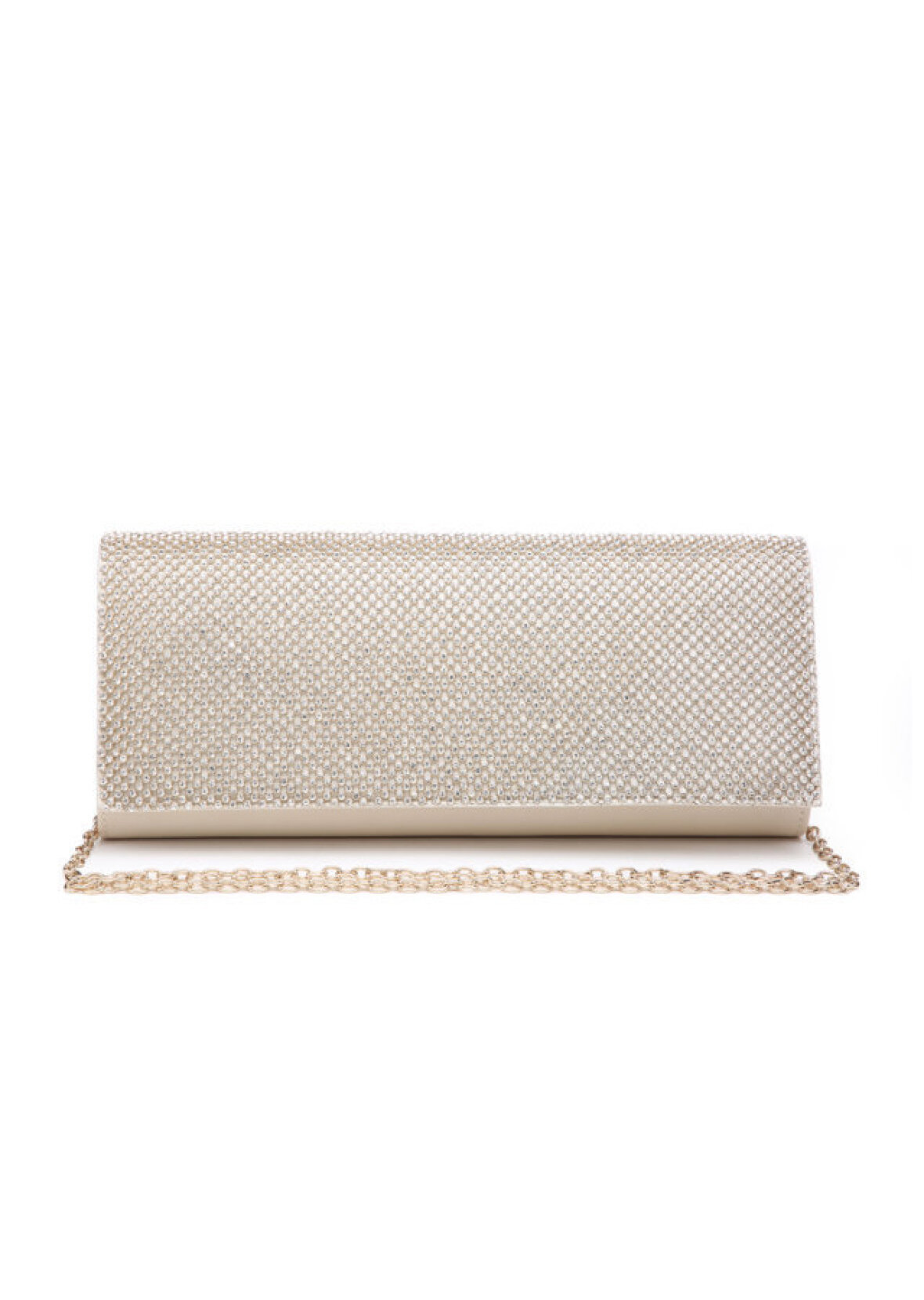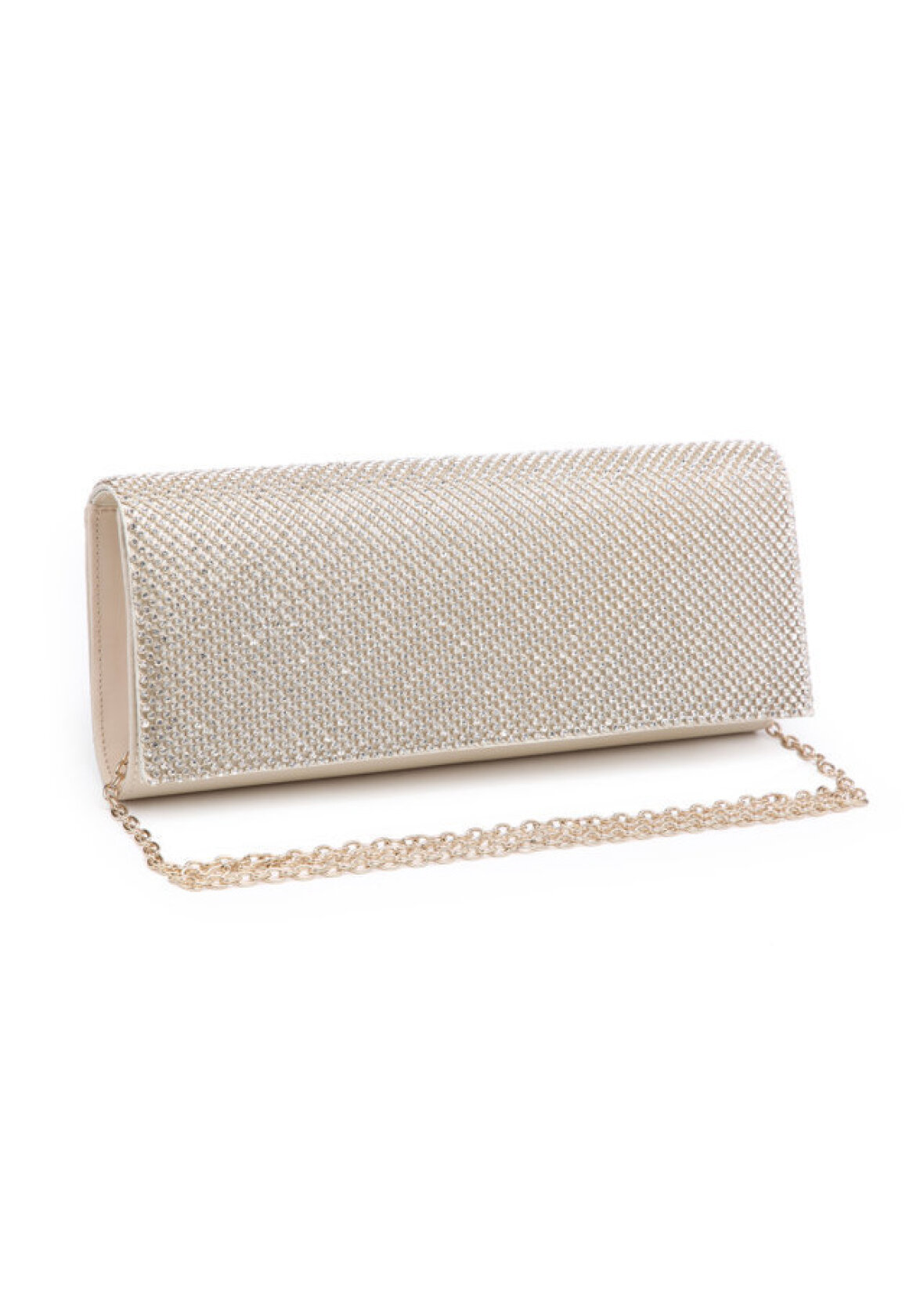 Elegant clutch i en luksuriøs, lys nuance med fuld rhinestone-besætning, der giver et funklende og eksklusivt udtryk. Tasken har en smuk guldkæde, der kan bruges som skulderrem, samt et klassisk og tidløst design. Perfekt til fester, events og enhver lejlighed, der kræver et glamourøst finish.
