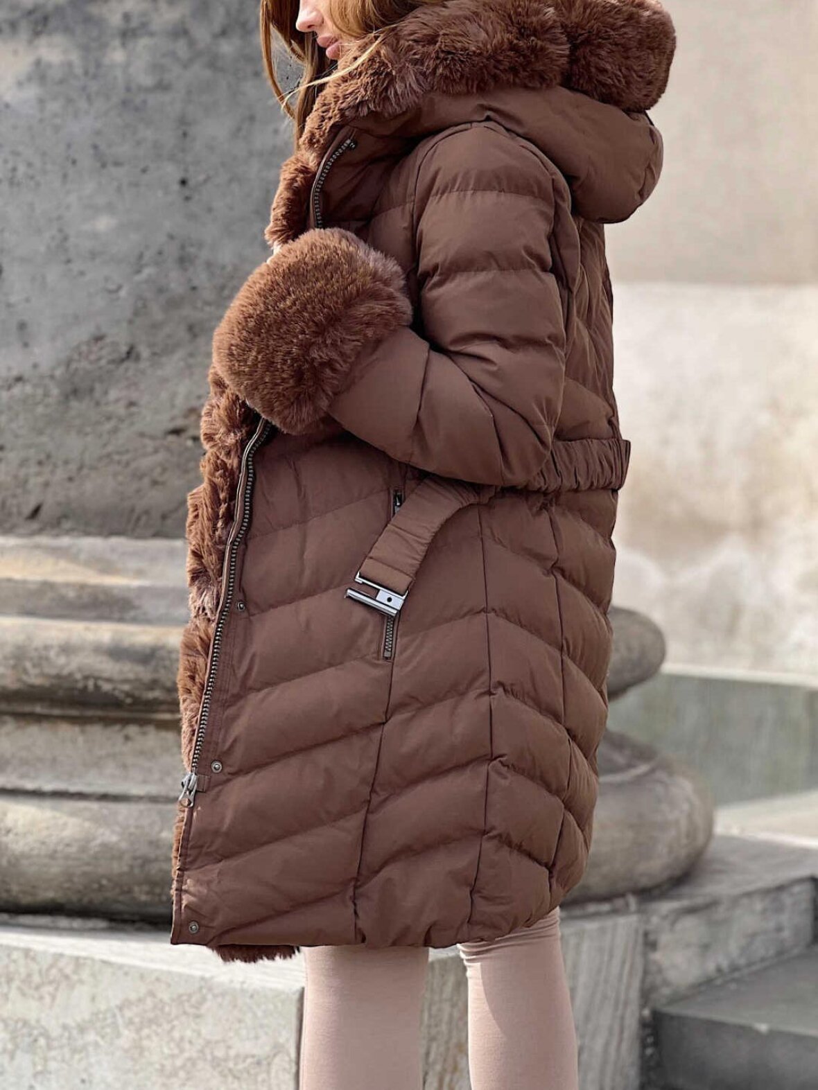 Luksuriøs vinterjakke i en dyb chokoladebrun farve med overdådige fake fur pelspaneler, der skaber et varmt, eksklusivt og feminint udtryk. Jakken har en smuk pasform, der fremhæver silhuetten, og den kraftige kvalitet sikrer optimal komfort. Perfekt til elegante vinterlooks og dig, der ønsker stil og varme i ét.