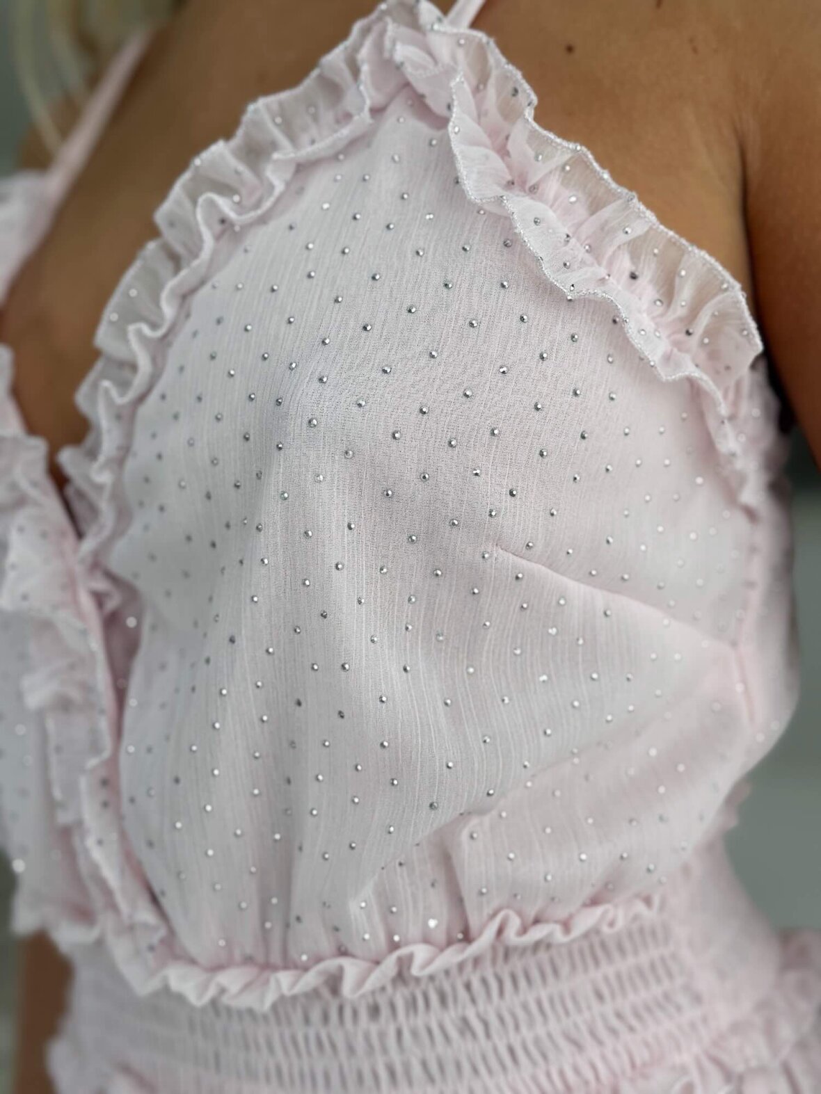 Denne elegante, lange lyserøde kjole fra Buch Copenhagen er designet i et let og luftigt materiale med fine glimmerdetaljer og feminine flæser. Kjolen har smalle stropper, V-udskæring og en let markeret talje med elastik, som giver en smuk og flatterende pasform. De lagdelte flæser skaber bevægelse og et romantisk udtryk, mens den lange længde tilfører et elegant og eksklusivt look. Perfekt til sommerfester, bryllupper, middage og andre festlige anledninger, hvor du ønsker et feminint og sofistikeret udtryk.