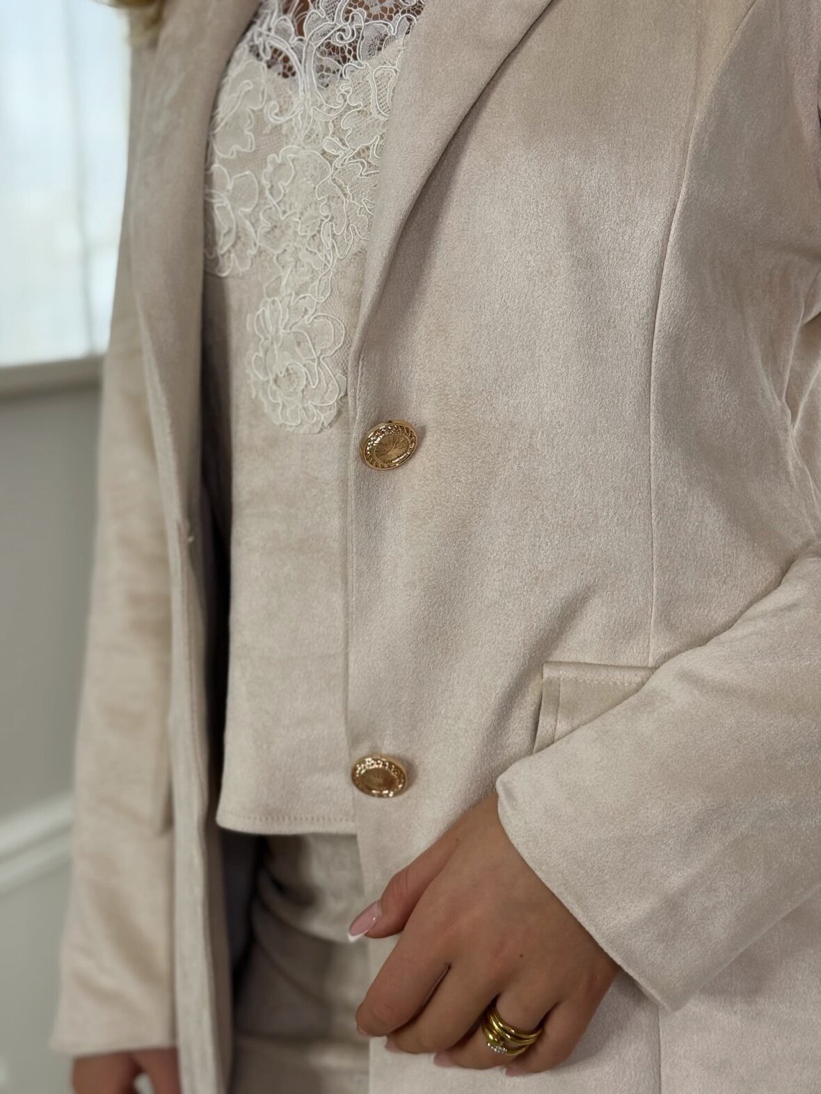 Elegant suede blazer i en lys beige tone med klassisk revers og gyldne knapper. Blazeren har en flot, let figursyet pasform og giver et eksklusivt udtryk, der fungerer perfekt både til hverdag og mere formelle anledninger. Et tidløst item til garderoben.