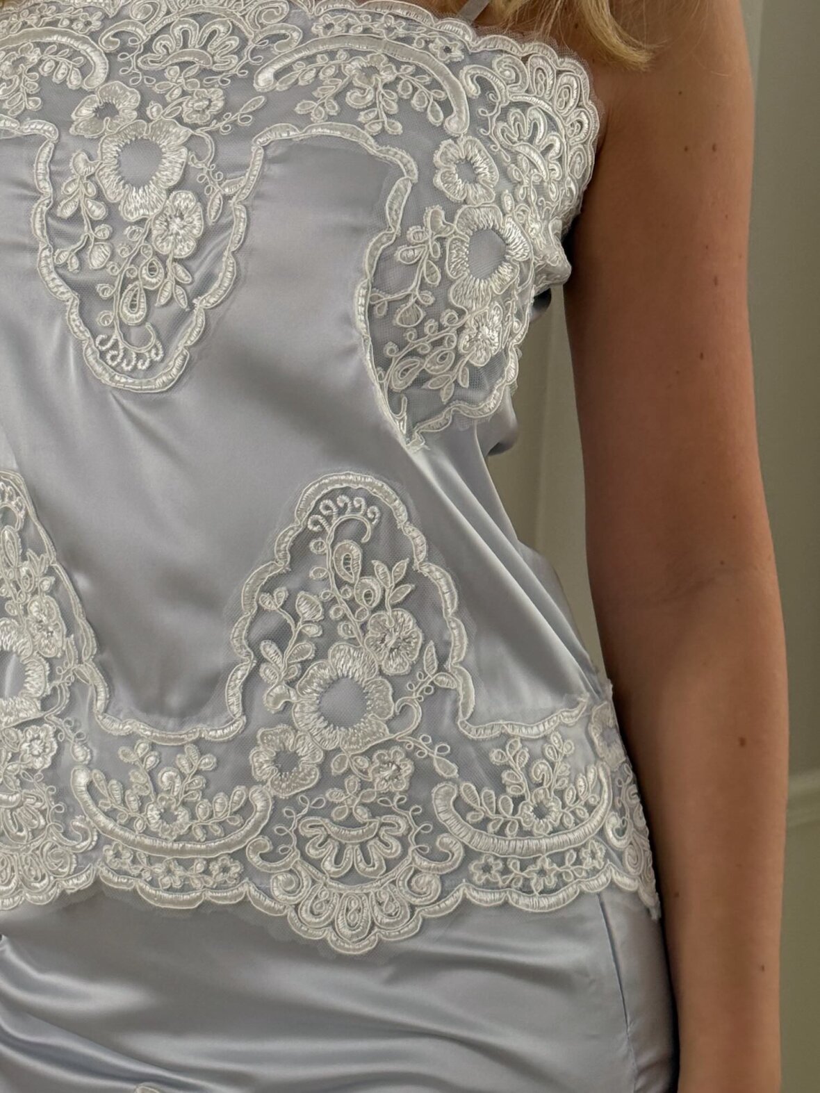 Elegant top i smuk, lys blå stræk satin med eksklusive blondedetaljer. Designet med fine stropper og dekorativ blondekant, der giver et feminint og sofistikeret udtryk. En let og behagelig top, som kan styles både alene eller som del af et elegant sæt.