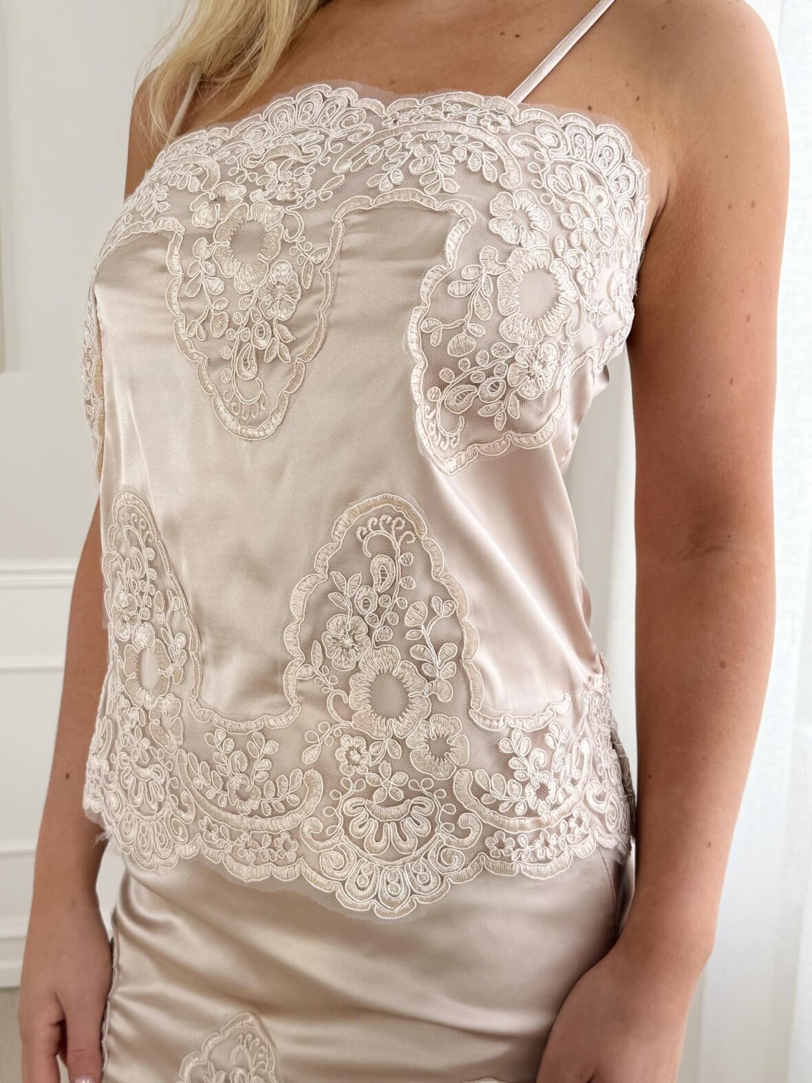 Denne elegante beige top fra Buch Copenhagen er designet i et glat og let materiale med smukke, detaljerede blondedekorationer, der giver et eksklusivt og feminint udtryk. Toppen har smalle stropper og en blød, lige udskæring, mens de fine blonder skaber et sofistikeret look og tilfører et romantisk touch. Den lette pasform gør toppen behagelig at have på og nem at style både alene eller sammen med nederdelen i samme design. En elegant top, der er ideel til festlige anledninger, middage og særlige events, hvor du ønsker et stilrent og feminint outfit.