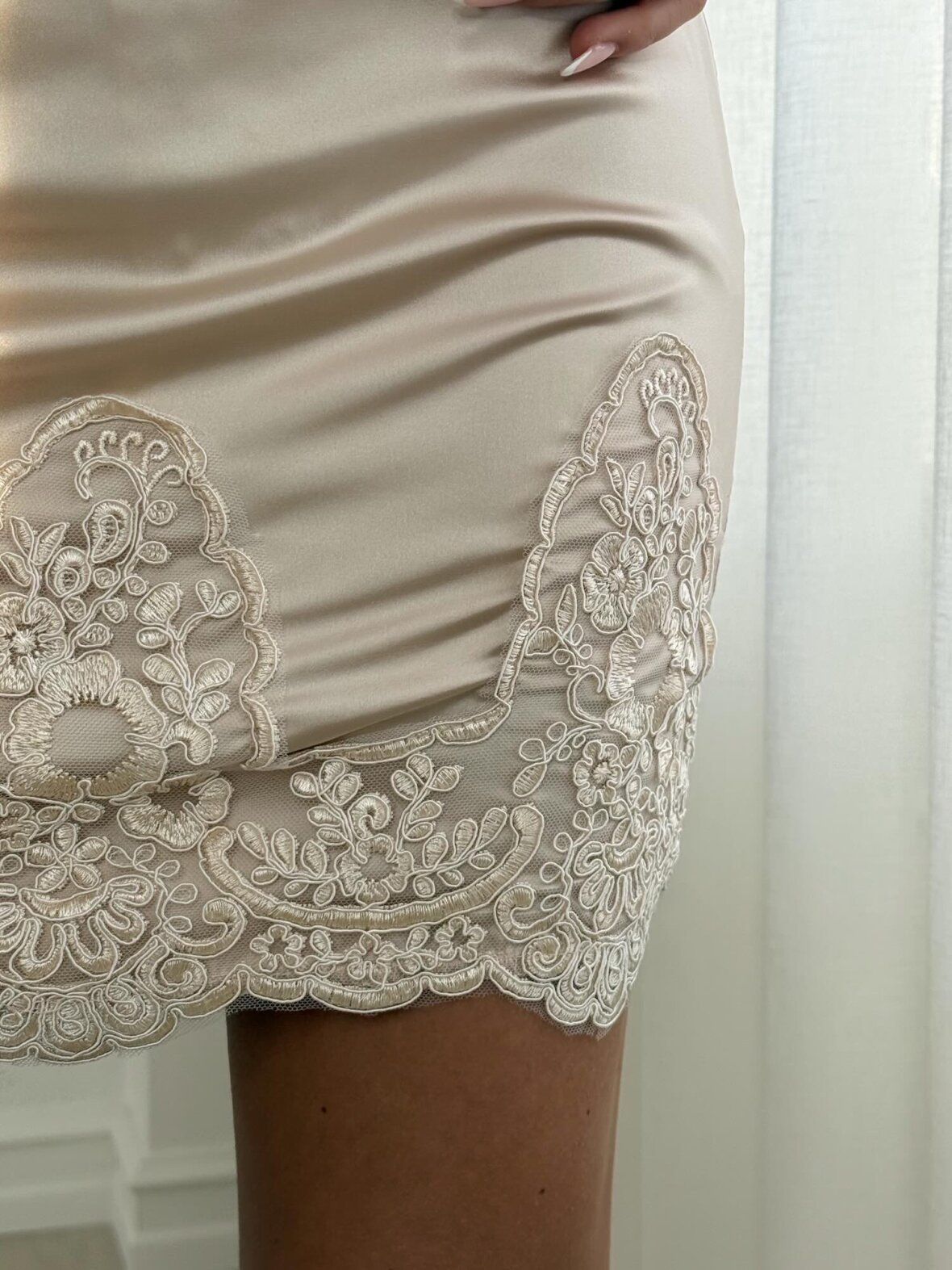 Denne elegante beige nederdel fra Buch Copenhagen er designet i et glat og let materiale med smukke, dekorative blondedetaljer langs kanten, der giver et feminint og eksklusivt udtryk. Nederdelen har en tætsiddende pasform, som smukt følger kroppen og fremhæver silhuetten på en elegant måde. Det bløde materiale føles behageligt mod huden og gør nederdelen komfortabel at have på, selv ved længere tids brug. De fine blonder tilfører et sofistikeret og romantisk look, der gør nederdelen ideel til både festlige anledninger, middage og særlige events. En stilren nederdel, der nemt kan styles med matchende top eller en enkel overdel for et gennemført outfit.