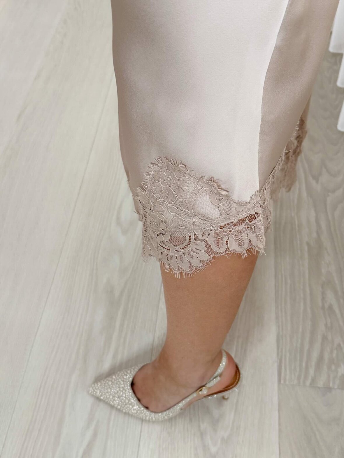 Denne elegante, beige kjole fra Buch Copenhagen er designet i et glat og let satinlook materiale, der falder smukt langs kroppen. Kjolen har smalle stropper, draperet udskæring og en figurnær pasform, som giver et feminint og sofistikeret udtryk. Den fine blondekant ved nederdelen tilfører en eksklusiv detalje og skaber et blødt, elegant finish. Længden gør kjolen ideel til både festlige anledninger og mere formelle events. En tidløs kjole, der kombinerer enkelhed med raffinerede detaljer.