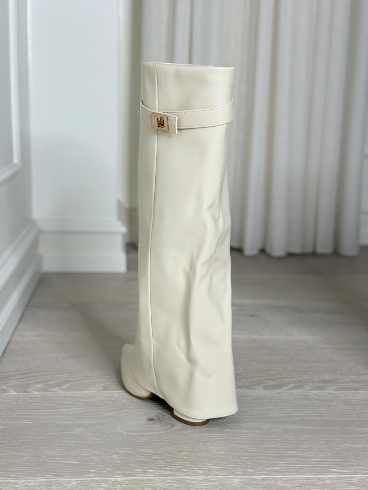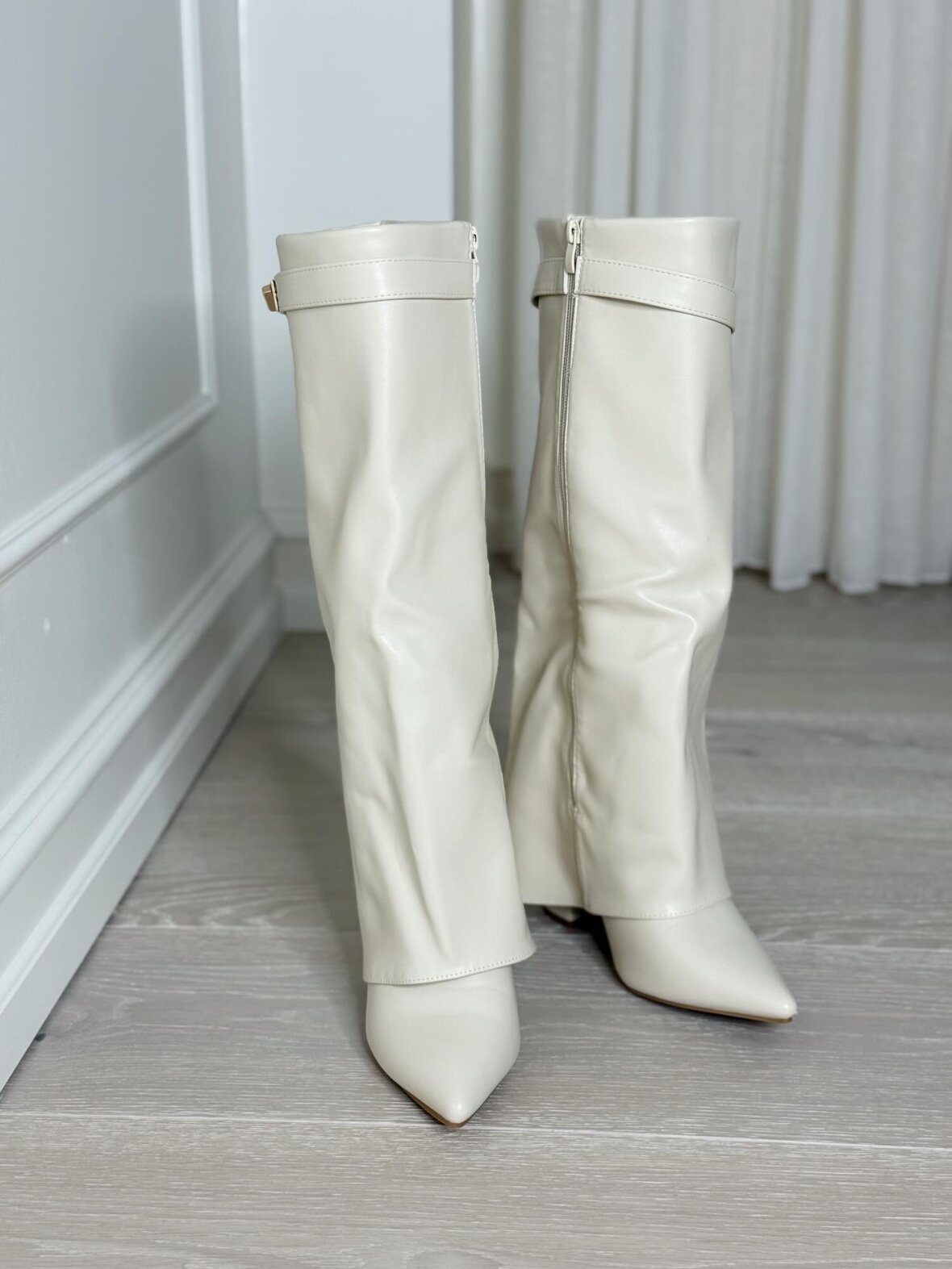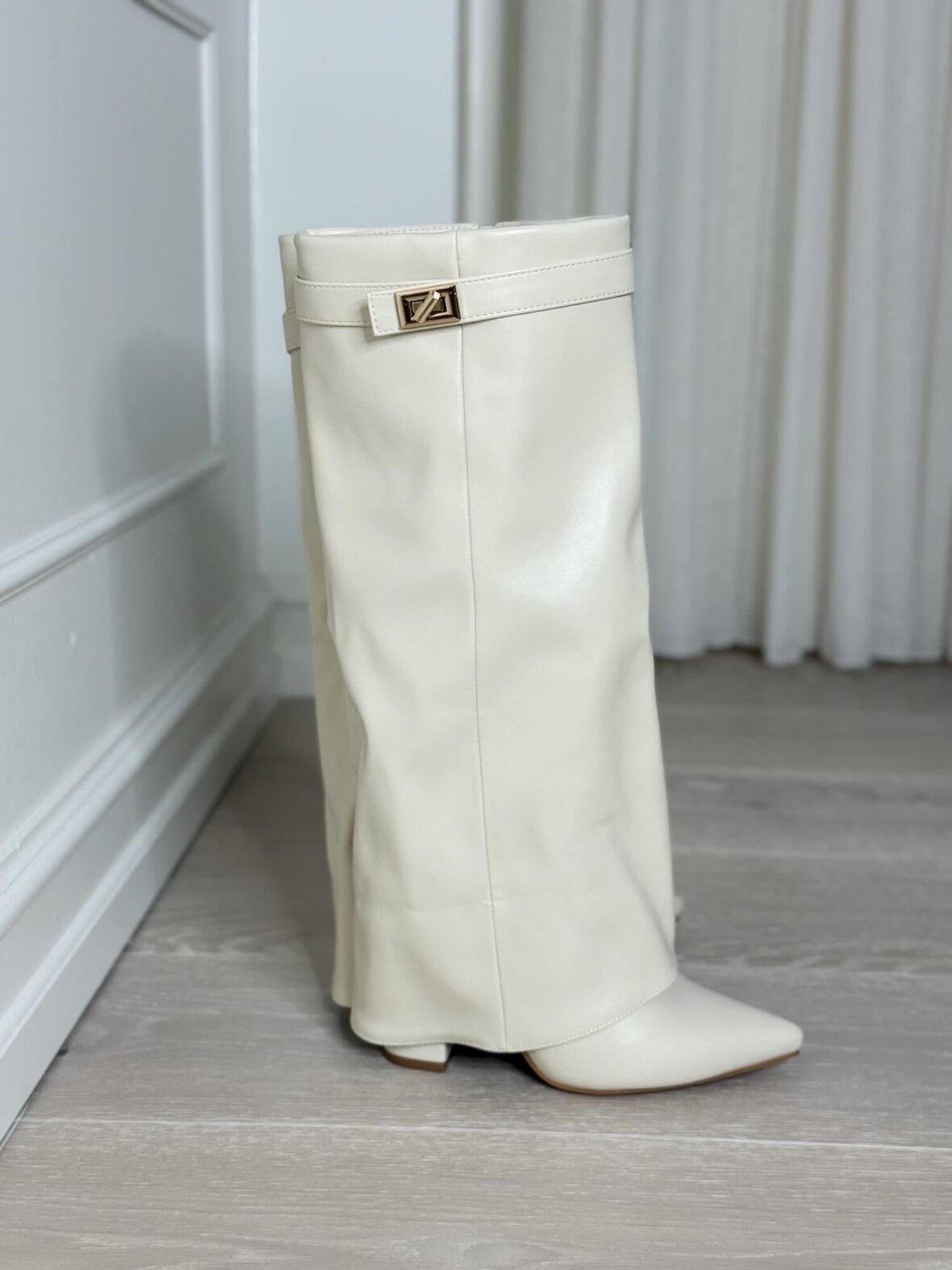 Disse elegante støvler er udført i en smuk creamfarvet nuance med et eksklusivt og sofistikeret udtryk. Det glatte materiale og det rene, enkle skaft giver støvlerne et tidløst look, der passer perfekt ind i en feminin og stilfuld garderobe. Den spidse snude tilfører et elegant præg, mens den stabile hæl sikrer komfort og et flot fald i silhuetten. En diskret rem med guldfarvet spænde ved skaftets top understreger det luksuriøse design og giver støvlerne et raffineret finish. Ideelle til både kjoler, nederdele og elegante bukser – fra hverdagsbrug til mere formelle anledninger.