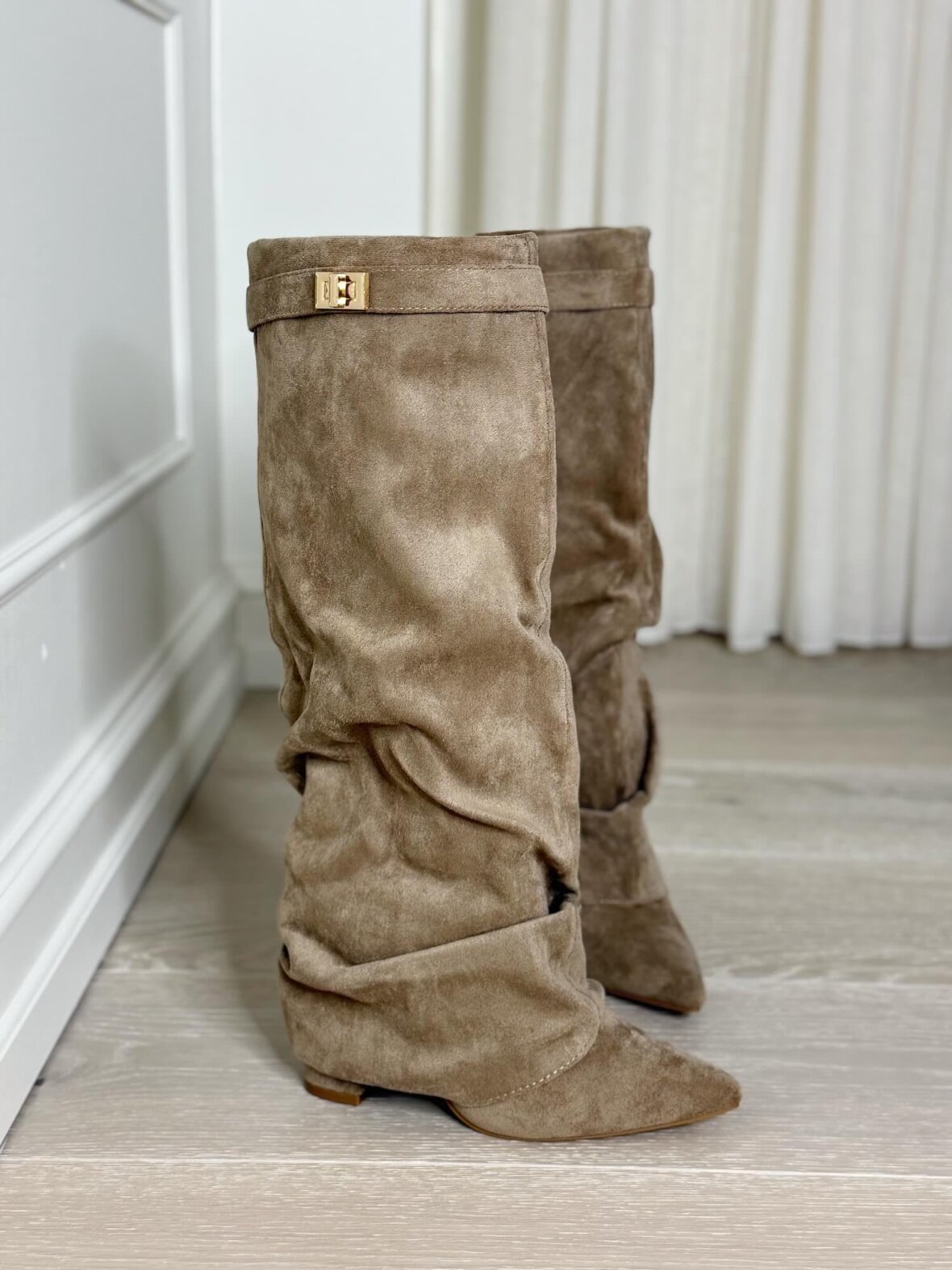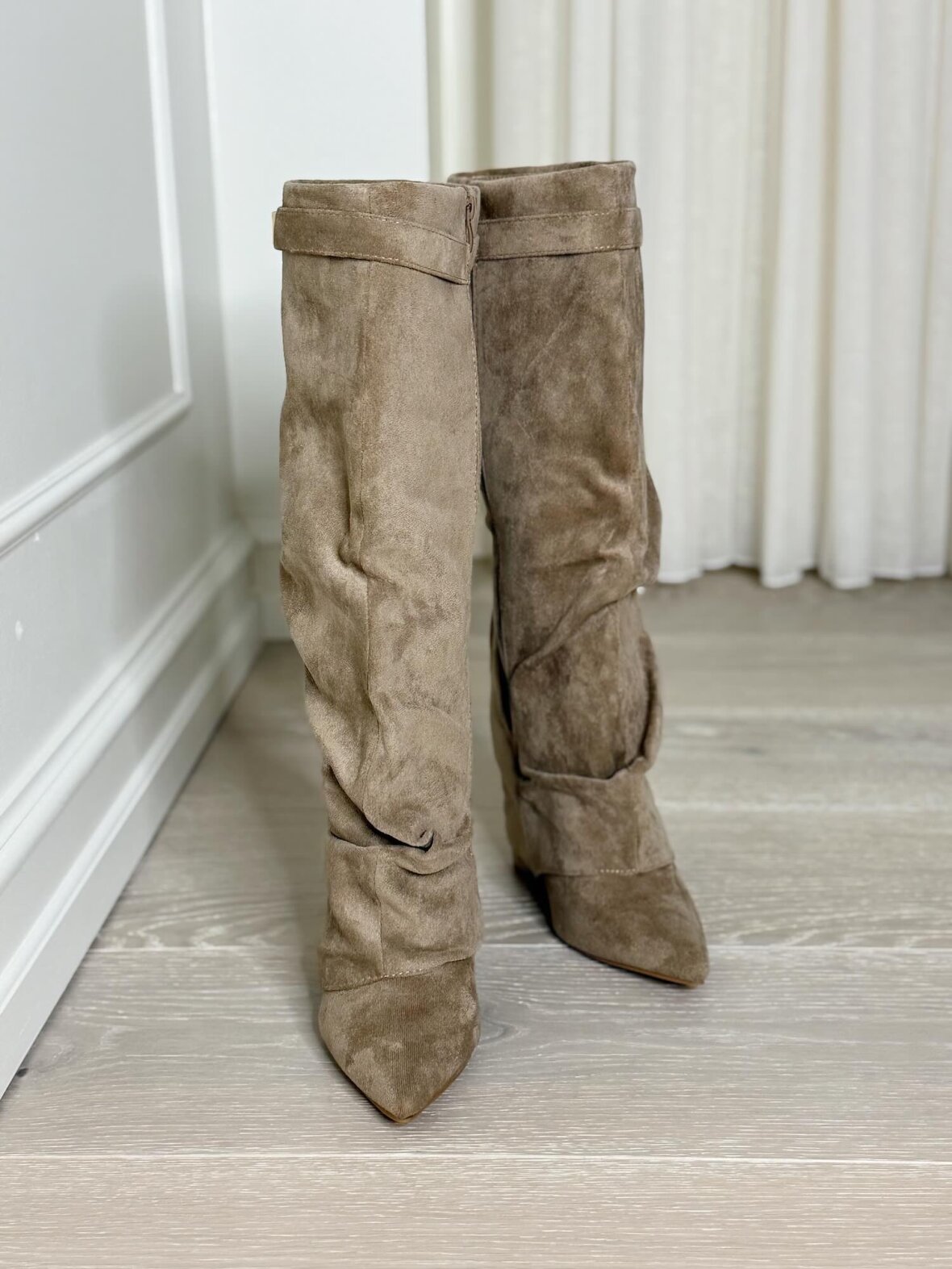 Disse elegante støvler er udført i en smuk khaki nuance med et blødt, ruskindsinspireret udtryk. Det let draperede skaft giver støvlen et feminint og eksklusivt look, mens den spidse snude og den stabile hæl skaber en flot, forlængende silhuet. Lynlåslukningen på indersiden gør støvlen nem at tage af og på, og den diskrete guldfarvede detalje ved skaftet tilfører et raffineret touch. En alsidig støvle, der kan styles både elegant og afslappet – perfekt til kjoler, vi kalder dem TikTok støvlerne.