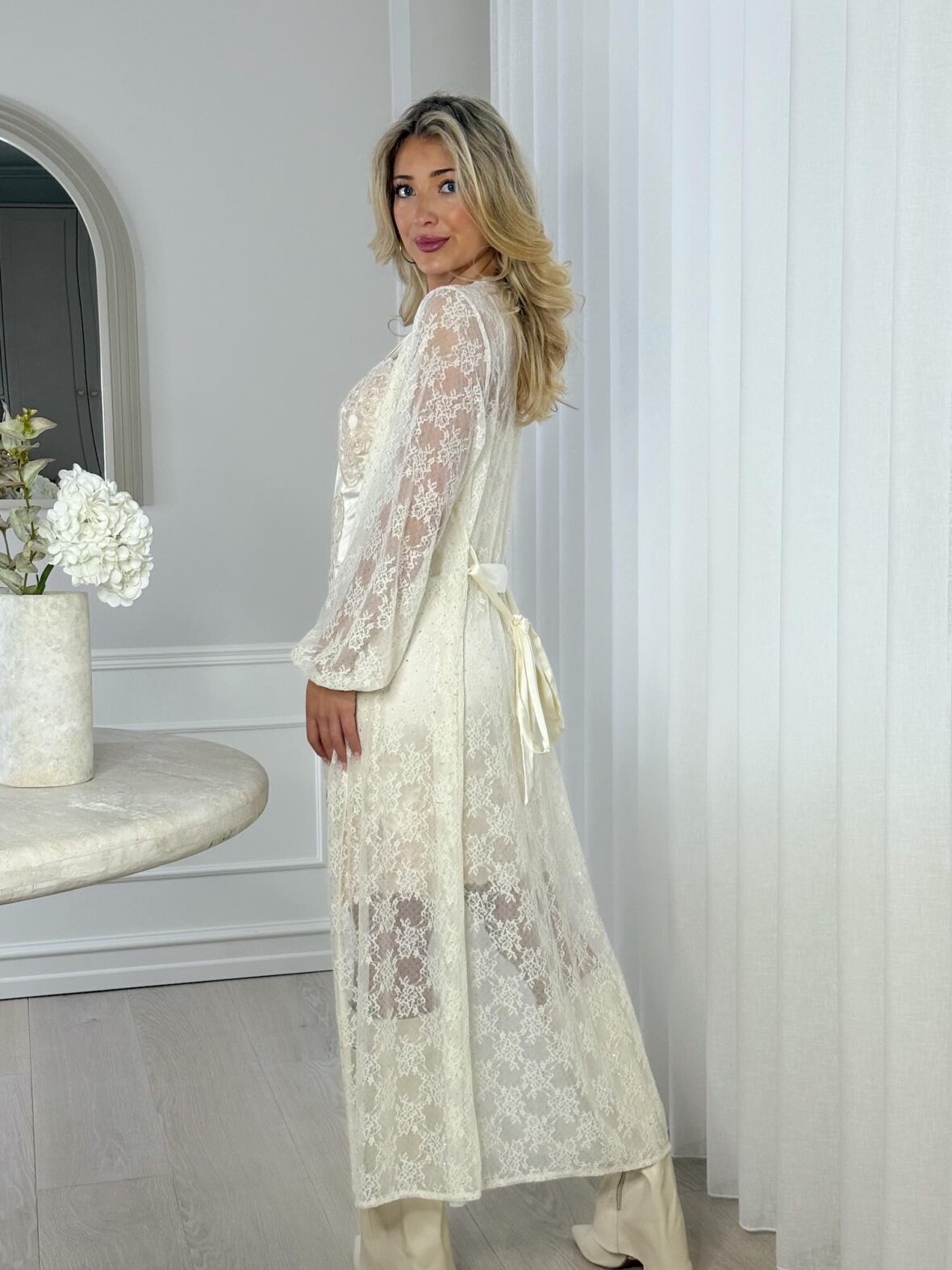 Denne elegante blonde kimono er udført i en smuk lys cremefarvet nuance og skaber et eksklusivt, feminint udtryk. Det let transparente blondemateriale giver et luftigt og sofistikeret look, mens den lange silhuet tilfører et elegant fald. Kimonoen lukkes med bindebånd i taljen, så pasformen nemt kan justeres. Perfekt som let lag over kjoler, toppe eller loungewear – både til festlige anledninger og afslappede stunder.