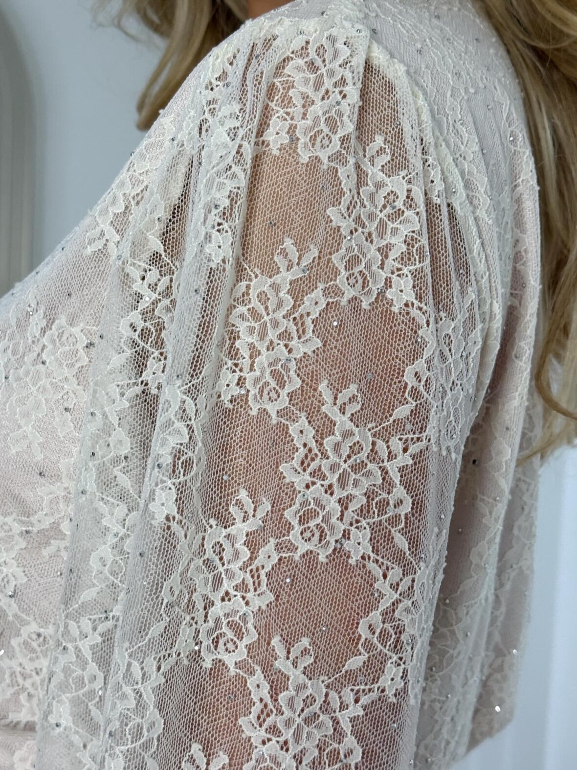 Denne feminine blondekjole er udført i en lys cremefarvet nuance og har et romantisk, elegant udtryk. Det let transparente blondemateriale kombineres med lag-på-lag effekt, som giver kjolen smukt fald og bevægelse. Den dybe V-udskæring fremhæves af et blødt bindebånd foran, mens de lange blondeærmer afsluttes med fine detaljer. En let taljemarkering skaber en flatterende silhuet, der gør kjolen velegnet til både festlige anledninger og særlige øjeblikke.