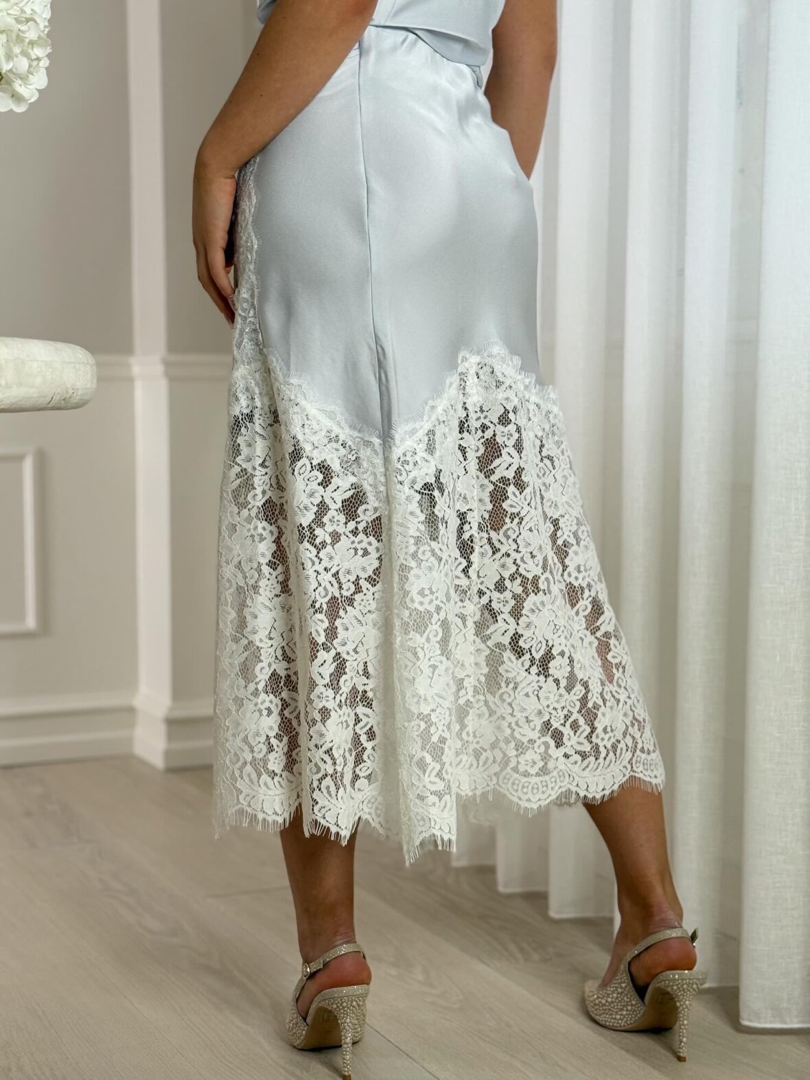 Denne elegante nederdel er udført i en smuk lys blå nuance og kombinerer et glat, let skinnende stof med rige blondedetaljer nederst. Den transparente blonde skaber et feminint og eksklusivt udtryk, mens den enkle silhuet giver et smukt fald og en lethed i looket. Nederdelen er perfekt til både festlige anledninger og elegante hverdagslooks, hvor den kan styles med en enkel top, skjorte eller strik.