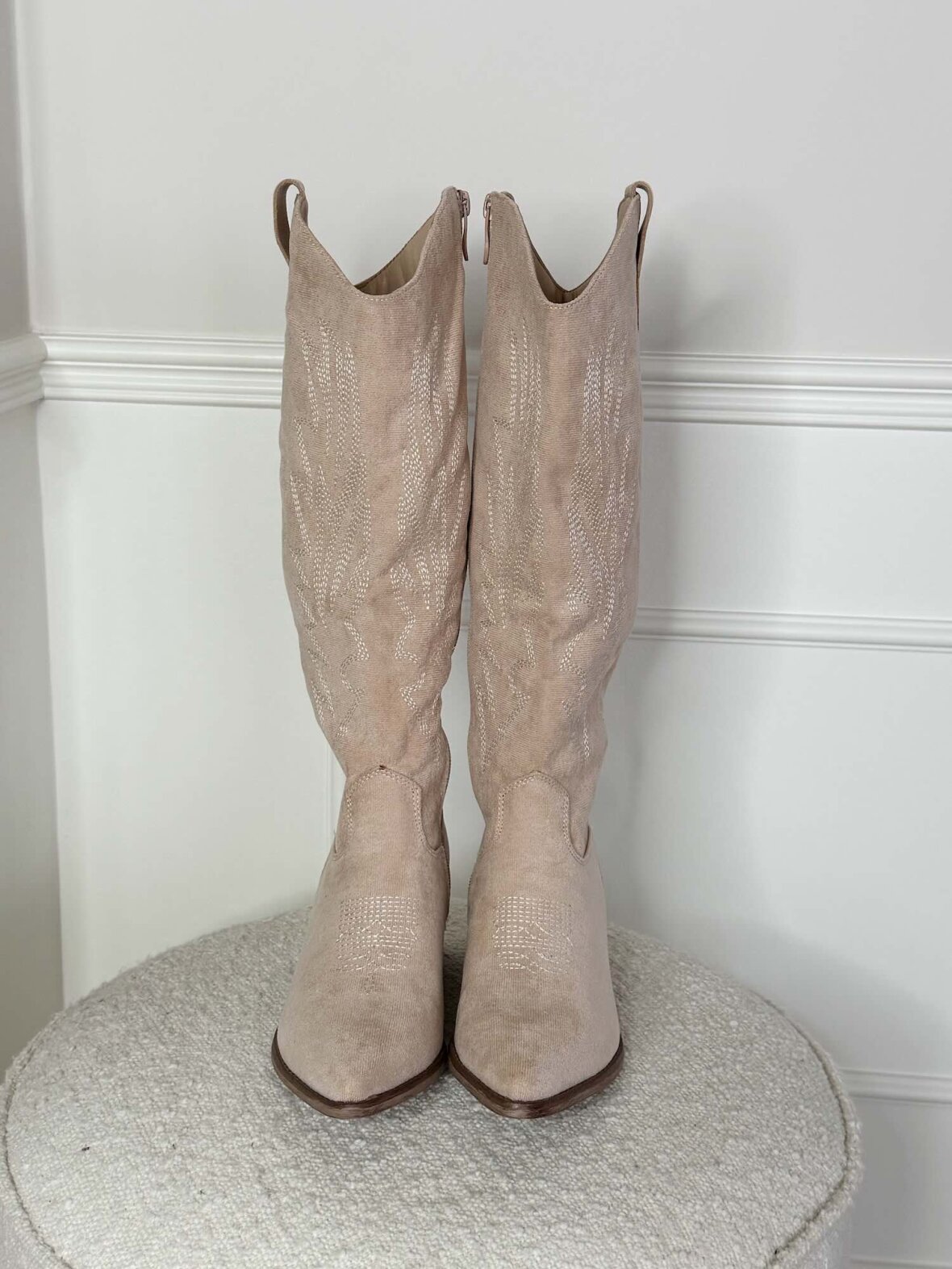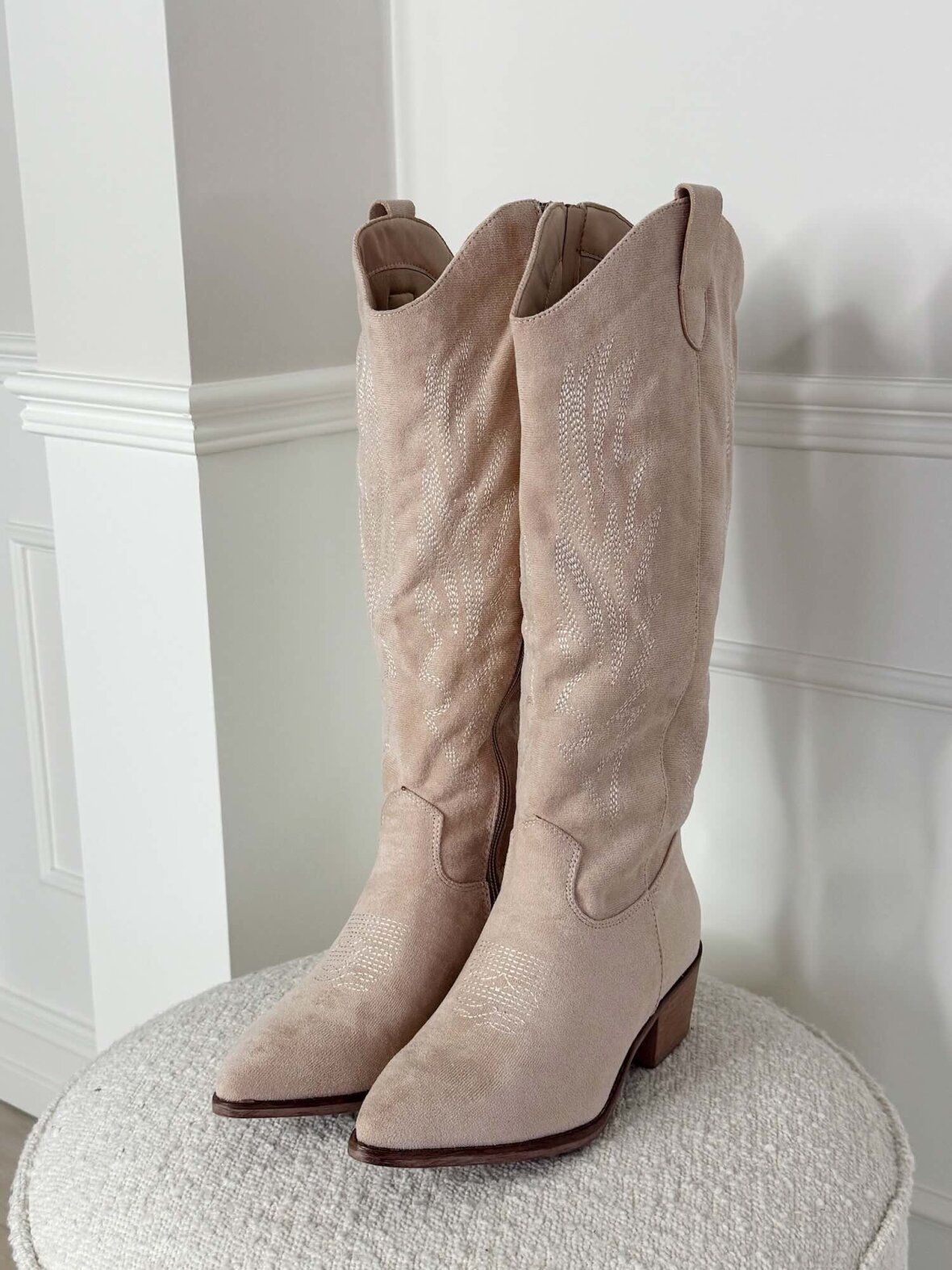 Disse cowboy støvler i lys beige/cream er designet i et elegant ruskindslook med diskrete broderede detaljer, der giver et feminint og tidløst udtryk. Den spidse snude kombineret med den stabile blokhæl skaber en flot balance mellem stil og komfort. Den lyse farve gør støvlerne ideelle til både forårs- og sommergarderoben og nemme at style med kjoler, nederdele og lyse jeans. Et alsidigt valg, der tilfører et eksklusivt western-inspireret touch til både hverdag og festlige anledninger.