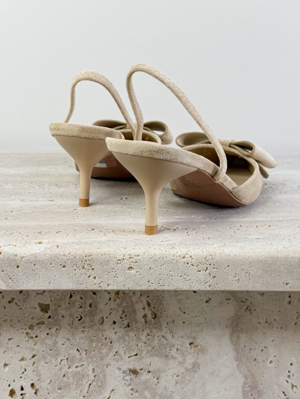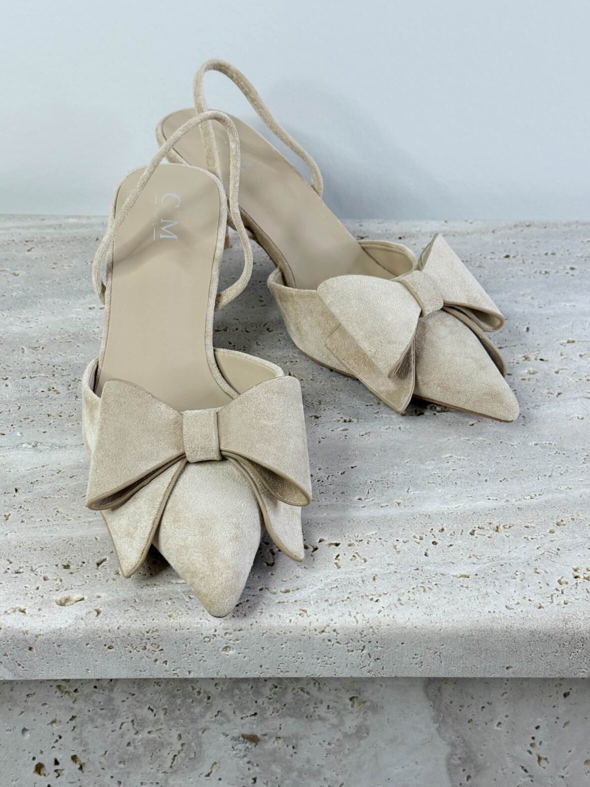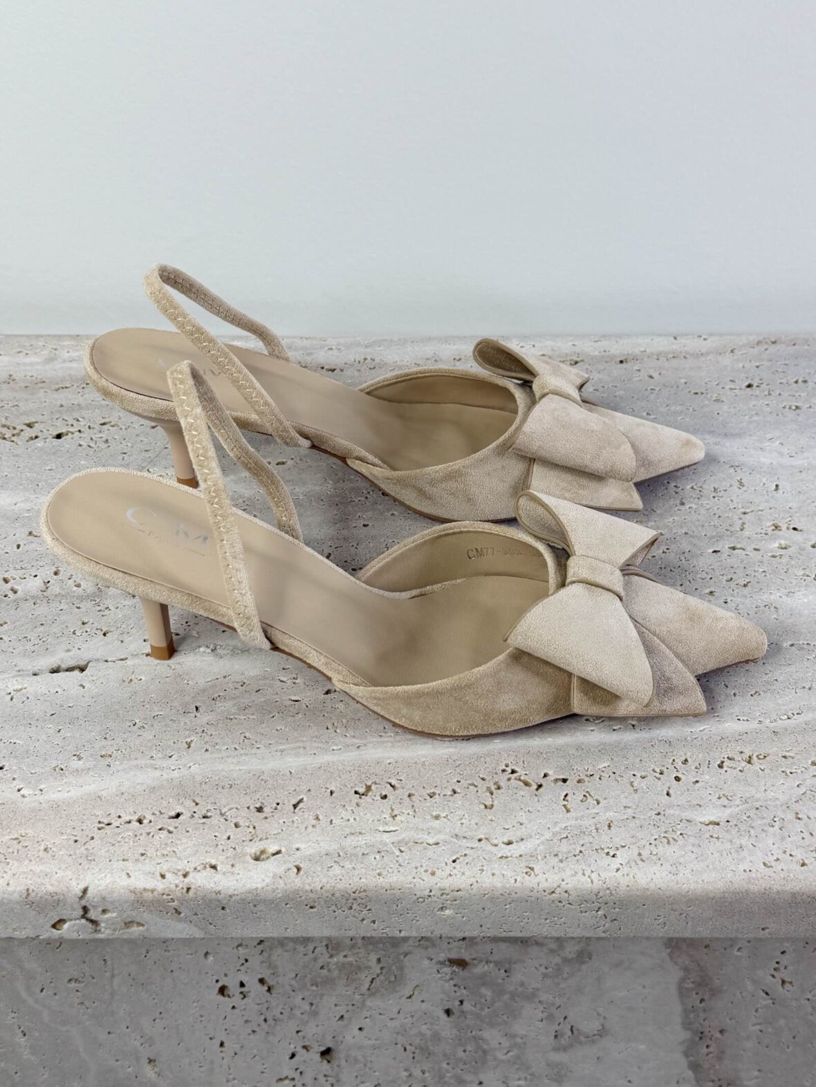 Disse elegante sandaler med lav hæl kombinerer feminin finesse med komfort. Designet er udført i et blødt ruskindslook i en smuk neutral nuance, der gør dem nemme at style til både hverdag og fest. Den dekorative sløjfe foran tilfører et eksklusivt og romantisk udtryk, mens den spidse snude giver et sofistikeret look. Den lave hæl og åbne hælkappe sikrer en behagelig pasform, så sandalerne kan bruges hele dagen. Perfekte til kjoler, nederdele og elegante bukser i forårs- og sommersæsonen.