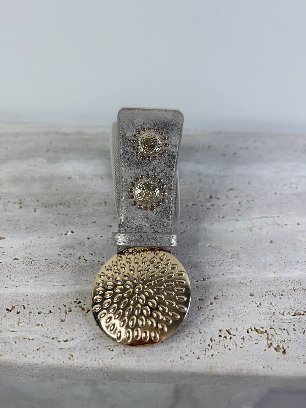 Dette eksklusive stretch bælte er designet med smukke metaldetaljer og en markant rund midterdekoration, der tilfører et elegant og feminint udtryk. Den elastiske kvalitet sikrer en behagelig pasform og gør bæltet ideelt til at fremhæve taljen på kjoler, tunikaer eller strik. De dekorative nitter og den gyldne finish giver bæltet et luksuriøst look, som nemt kan styles til både hverdag og fest. Et stilfuldt accessory, der skaber form og fuldender dit outfit med et moderne og sofistikeret touch.