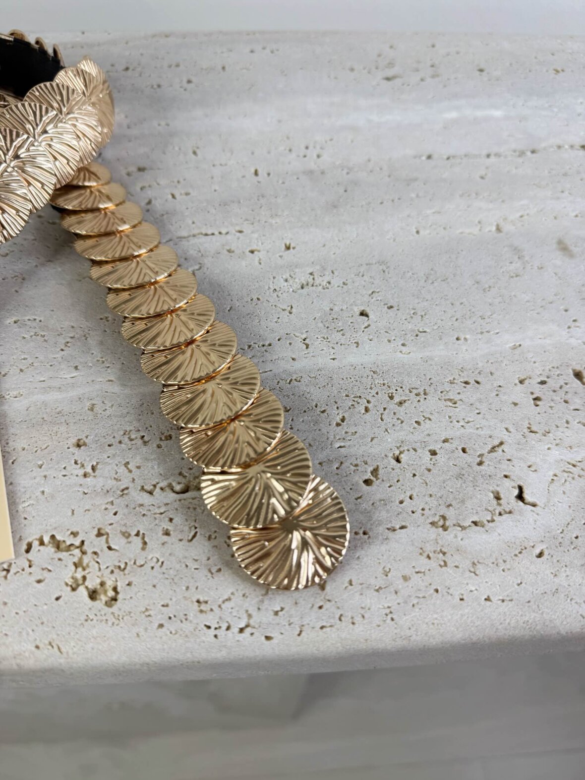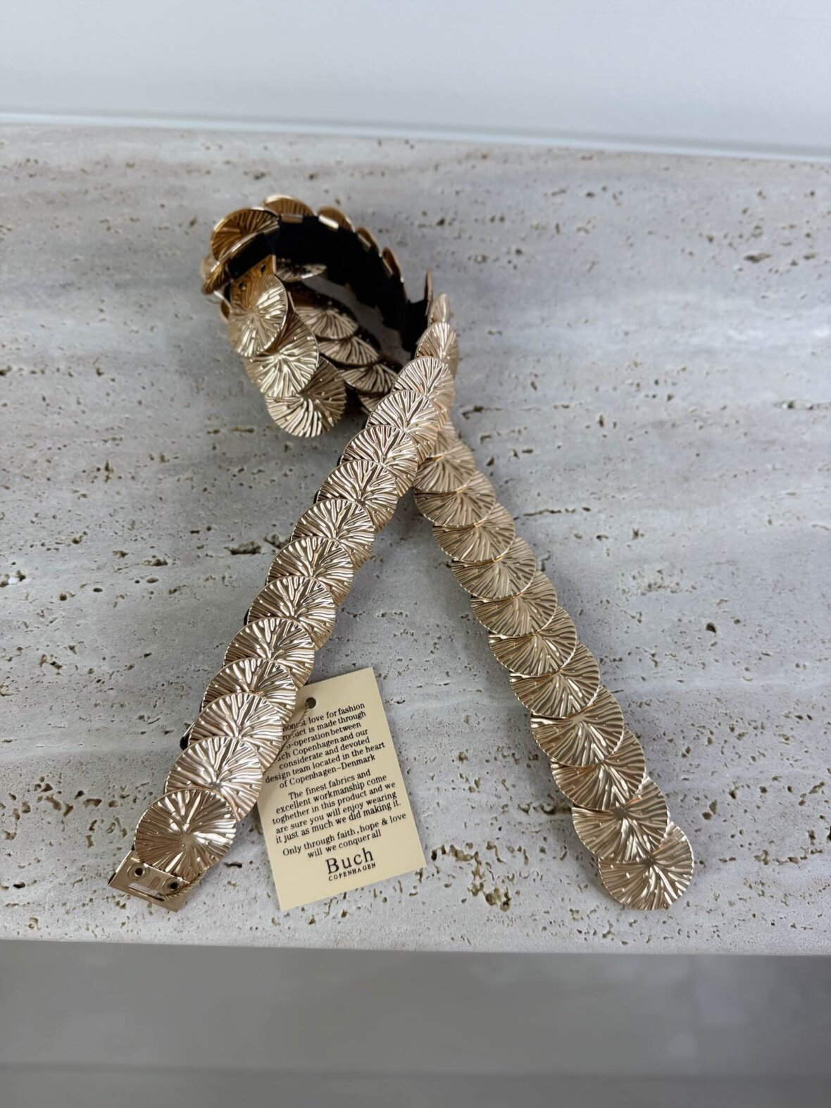 Dette elegante stretch bælte er designet med dekorative, guldfarvede metalplader, der giver et eksklusivt og feminint udtryk. Det elastiske materiale sikrer en komfortabel pasform og gør bæltet nemt at tilpasse kroppen. Perfekt til at fremhæve taljen på kjoler, tunikaer og blazere – både til hverdag og fest. De detaljerede metalmotiver tilfører et sofistikeret touch og gør bæltet til et statement-accessory. Et stilfuldt valg til dig, der ønsker at kombinere komfort og design i garderoben 2026.