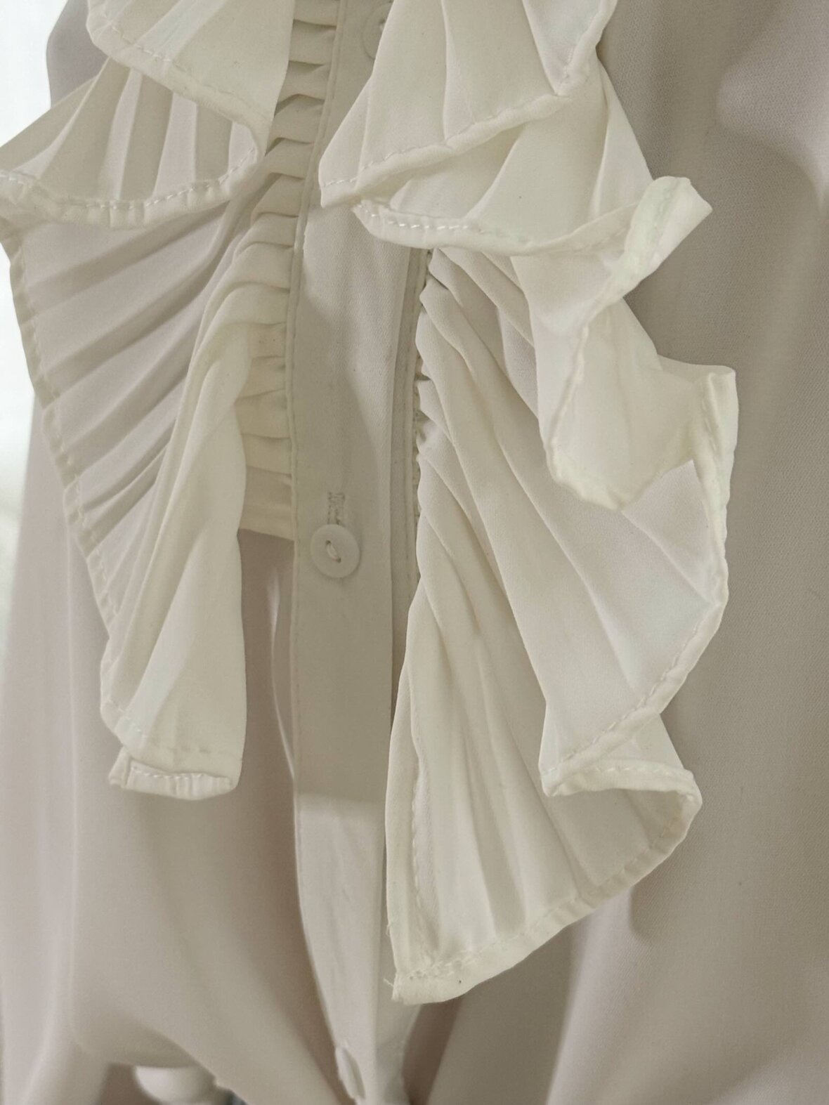 Denne elegante hvide skjorte er designet med smukke plisserede flæsedetaljer, der skaber et feminint og eksklusivt udtryk. Skjorten har en let og glat kvalitet, som falder flot på kroppen og giver høj komfort hele dagen. De dekorative flæser langs fronten og ved halsudskæringen tilfører et sofistikeret look, der nemt kan styles både til hverdag og fest. Brug den til jeans for et afslappet udtryk eller til nederdel og bukser for et mere klassisk look. En tidløs skjorte, der passer perfekt ind i garderoben og sæsonens trends i 2026.