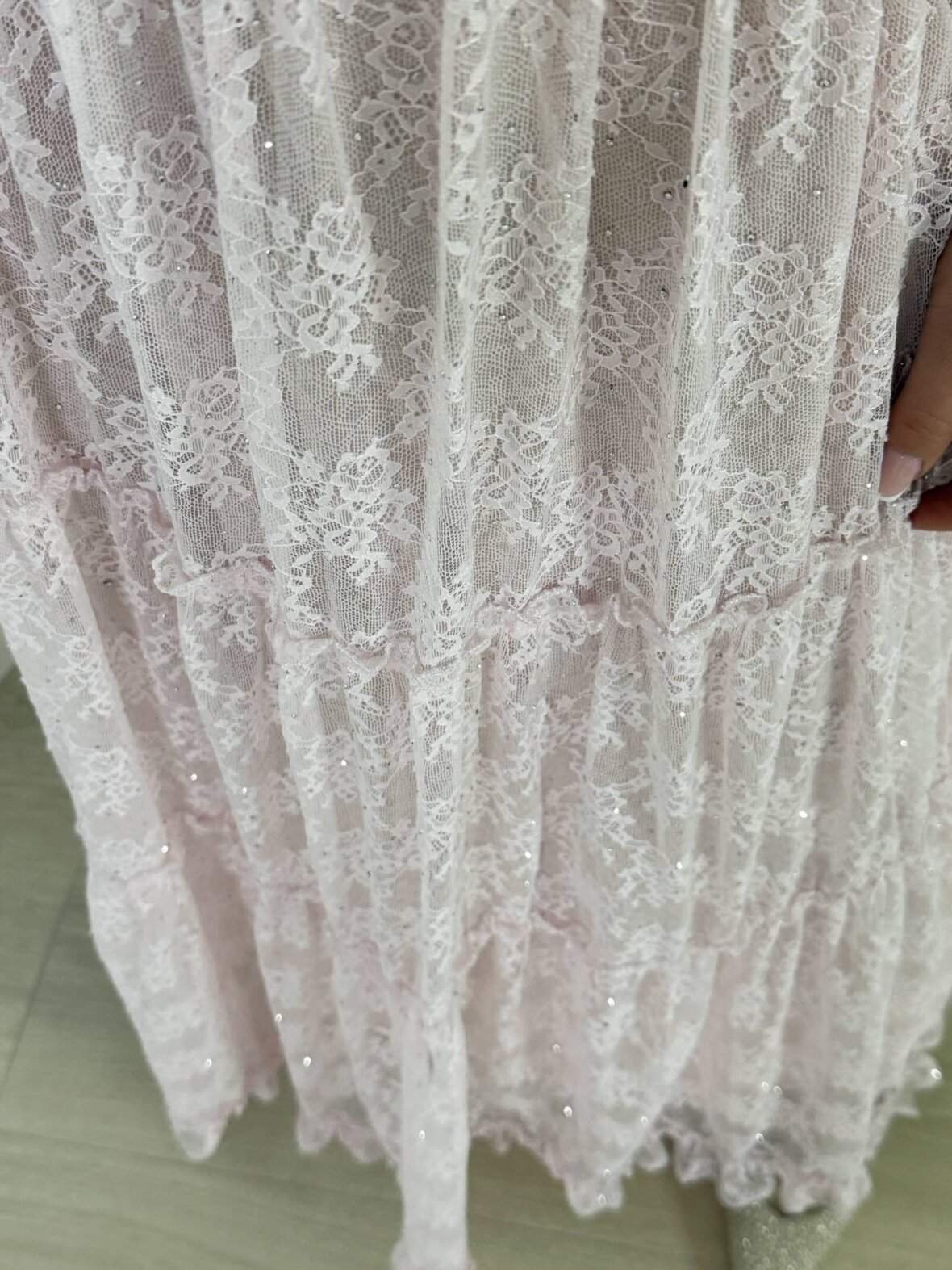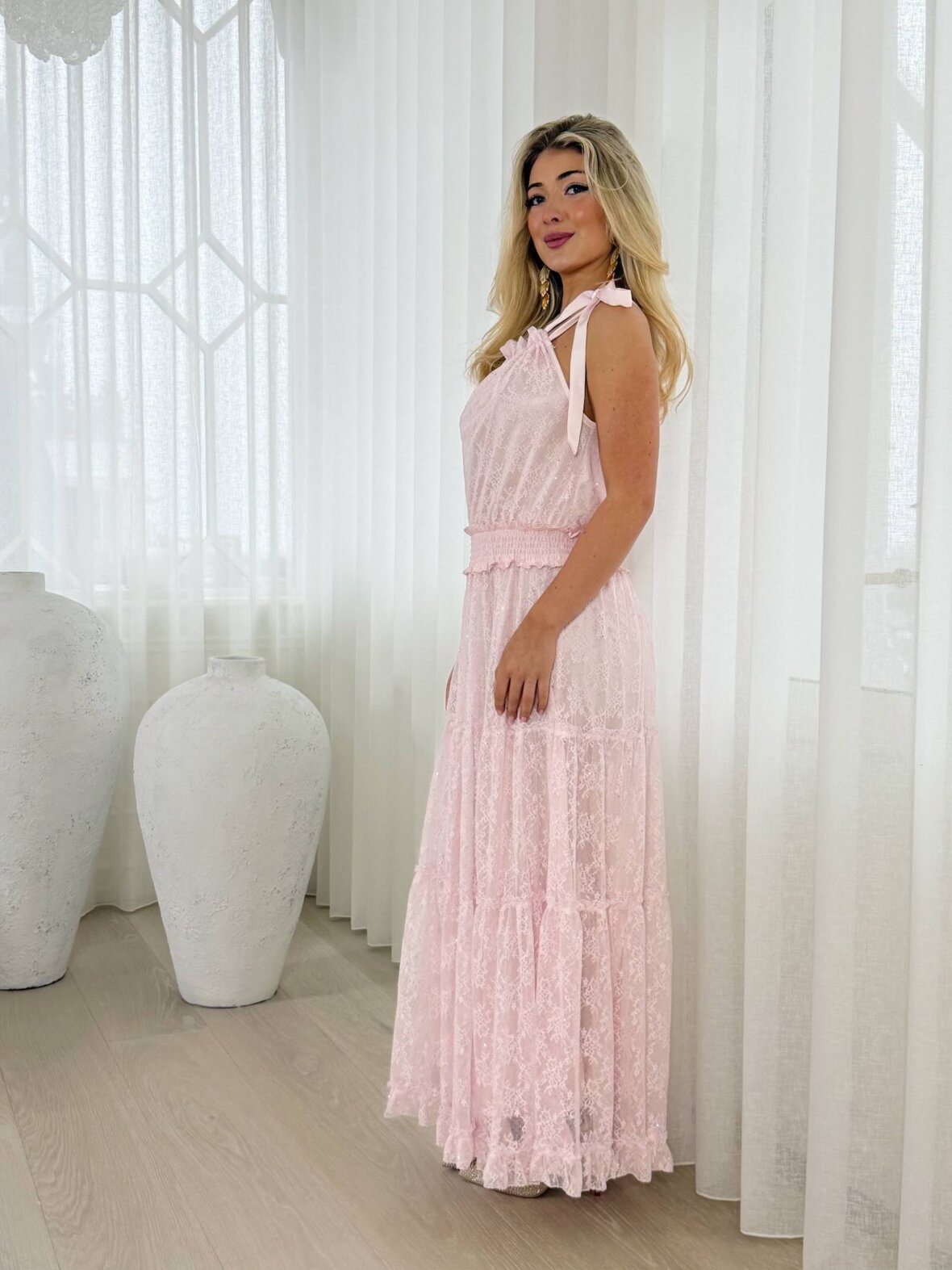 Elegant lang blondekjole i en smuk rosa nuance, dekoreret med fine små sten, som giver et diskret og eksklusivt udtryk. Kjolen er designet med lette blonder i flere lag, der skaber et feminint fald og smuk bevægelse. Den høje hals med bindebånd tilfører et romantisk touch, mens den let markerede talje fremhæver figuren på en elegant måde. Det lange skørt afsluttes med fine blondekanter, som understreger kjolens delikate design. En raffineret kjole, ideel til festlige anledninger, bryllupper og særlige øjeblikke.