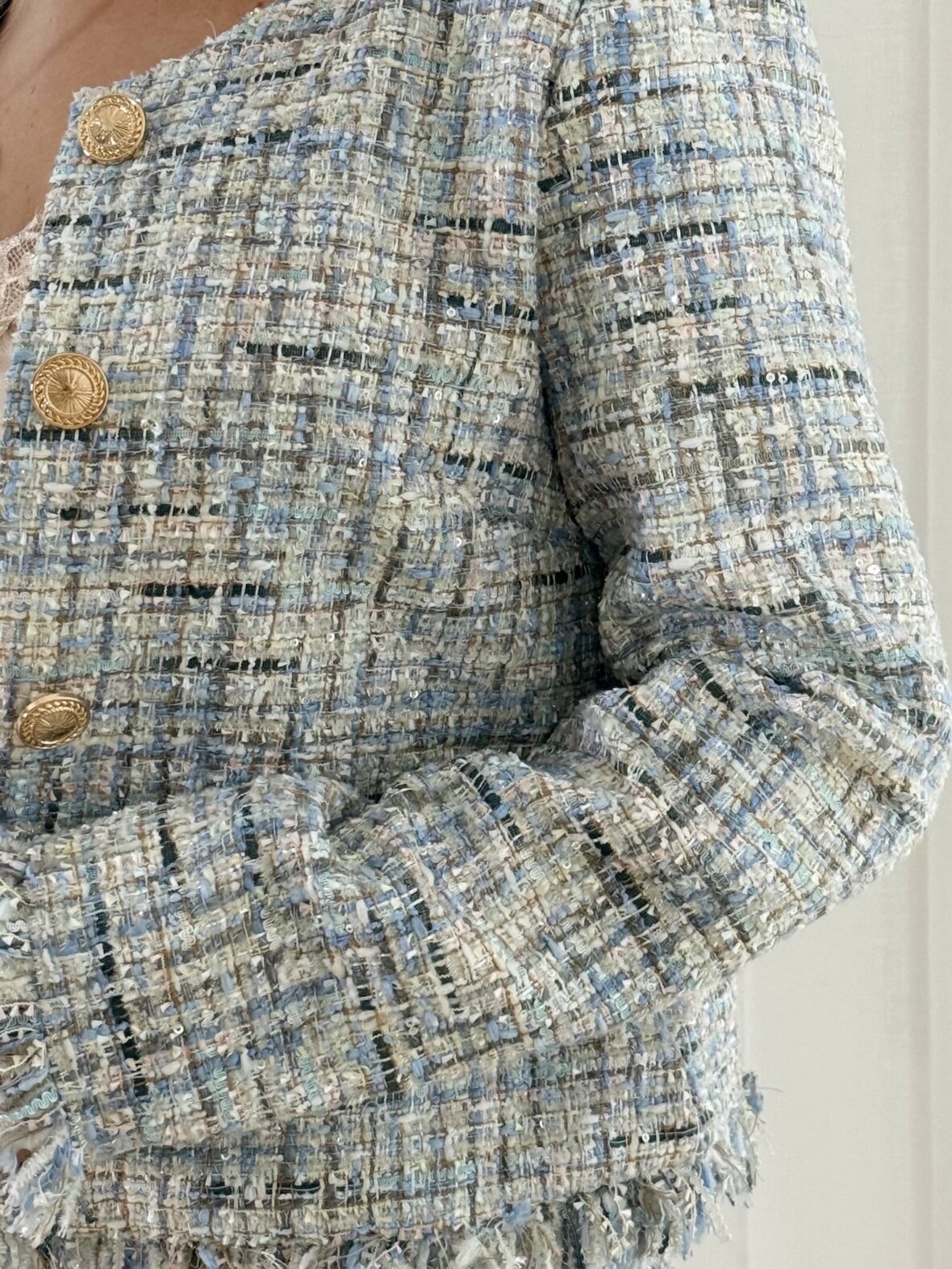 Elegant bouclé jakke i en lys og eksklusiv farvemix af lyseblå og creme nuancer. Jakken er designet i klassisk bouclé-kvalitet med en let struktureret overflade, der giver et sofistikeret og tidløst udtryk. Den korte længde og lige pasform skaber en elegant silhuet, mens de dekorative knapper foran tilfører et raffineret finish. Jakken afsluttes med fine frynsekant-detaljer ved kant og ærmer, som understreger det feminine design. En stilfuld jakke, der fungerer perfekt både til hverdag og festlige anledninger.