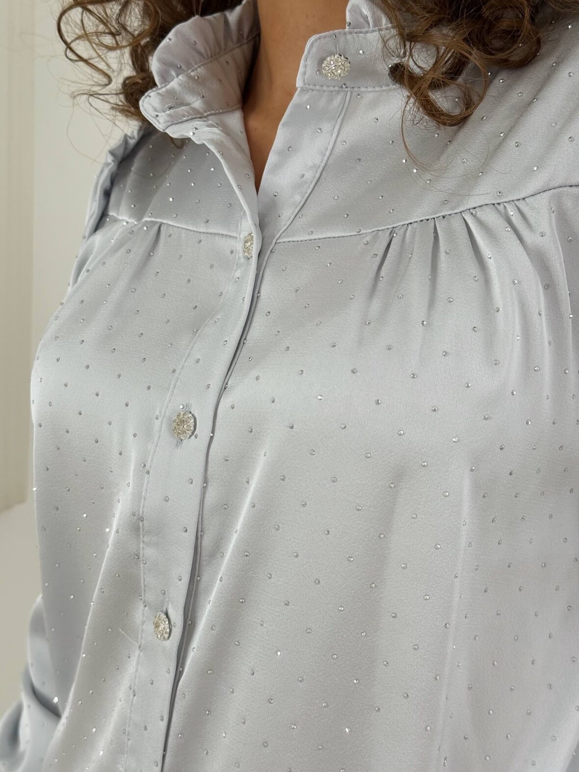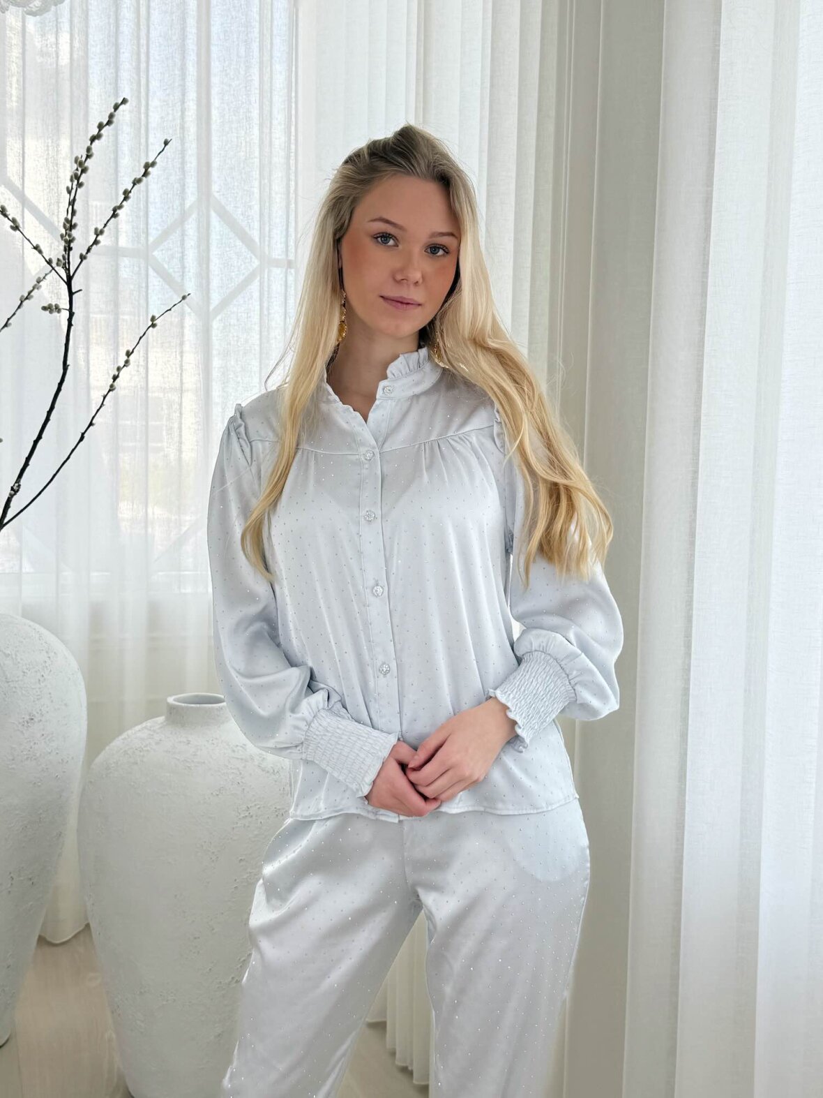 Denne lyseblå satin skjorte fra Buch Copenhagen er en feminin og elegant skjorte med et let og eksklusivt udtryk. Den bløde satin falder smukt og skaber et sofistikeret look, mens de fine rynkedetaljer og knapper foran tilfører et romantisk touch. Skjorten har en flatterende pasform med lange ærmer og elegante manchetter. Perfekt til både hverdag og pænere brug, hvor den kan styles med bukser eller nederdel for et stilfuldt outfit.